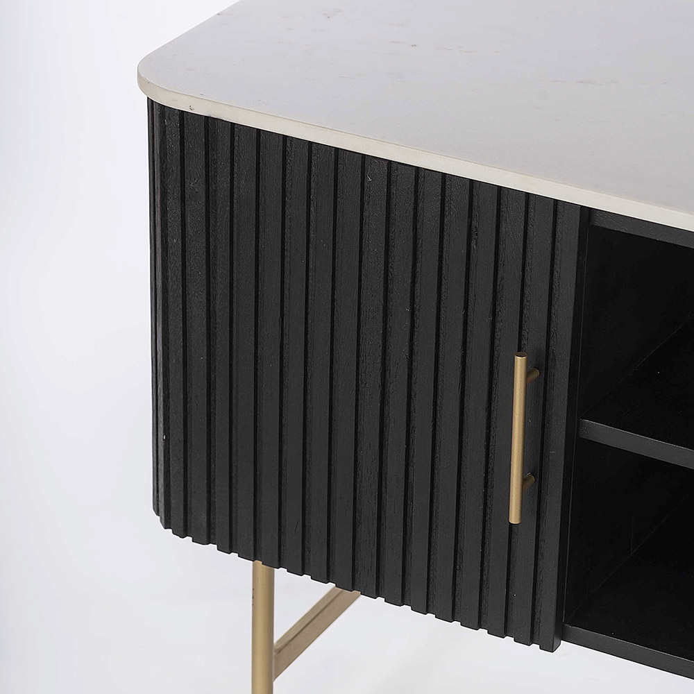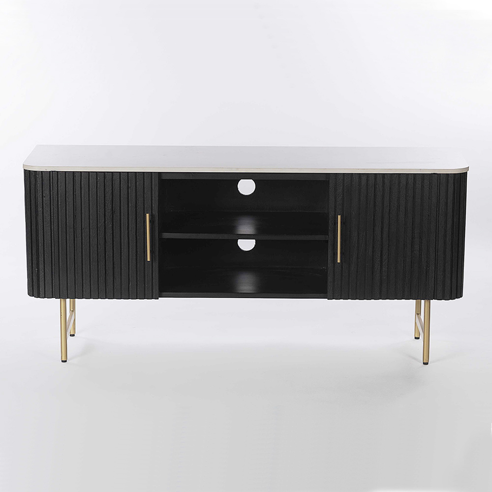 Deze TV-standaard is de essentie van hedendaagse elegantie, een combinatie van modern design en functionaliteit . Het zwarte gegroefde houten frame geeft een verfijnd driedimensionaal effect, perfect in evenwicht gehouden door de gladde bovenkant die een verfijnde touch toevoegt. De dunne maar stevige gouden metalen poten geven visuele lichtheid en zorgen voor stabiliteit.