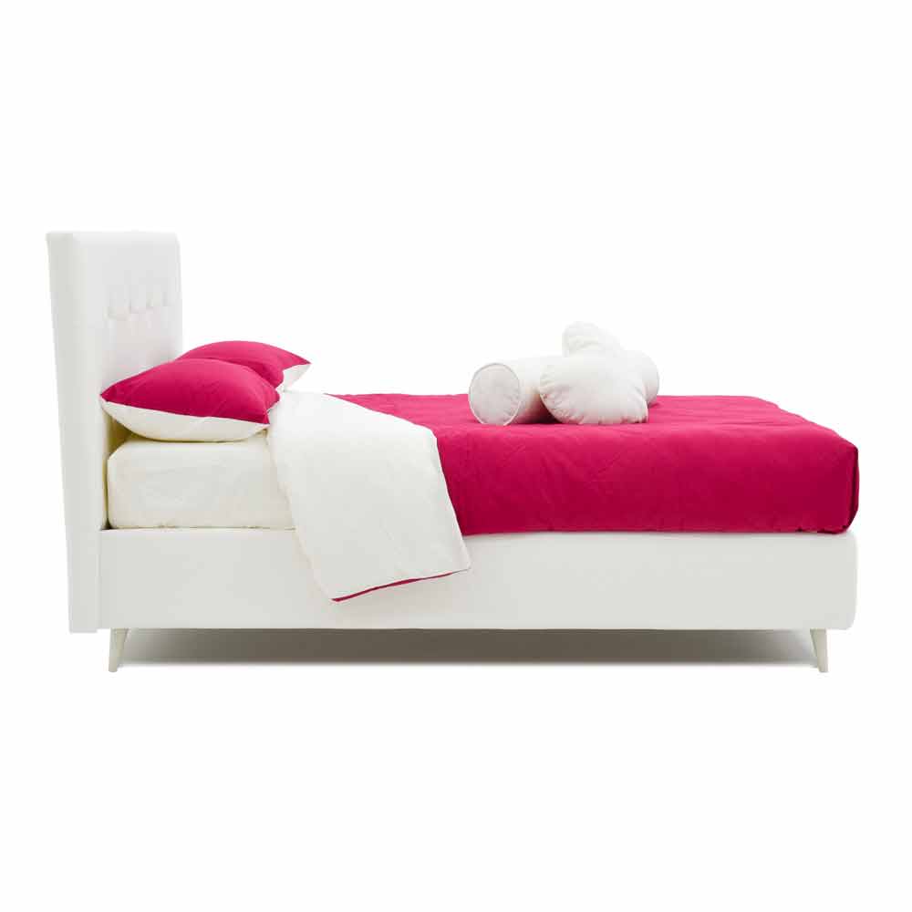 Design tweepersoonsbed met witte houten poten en bekleding van imitatieleer Made in Italy.
