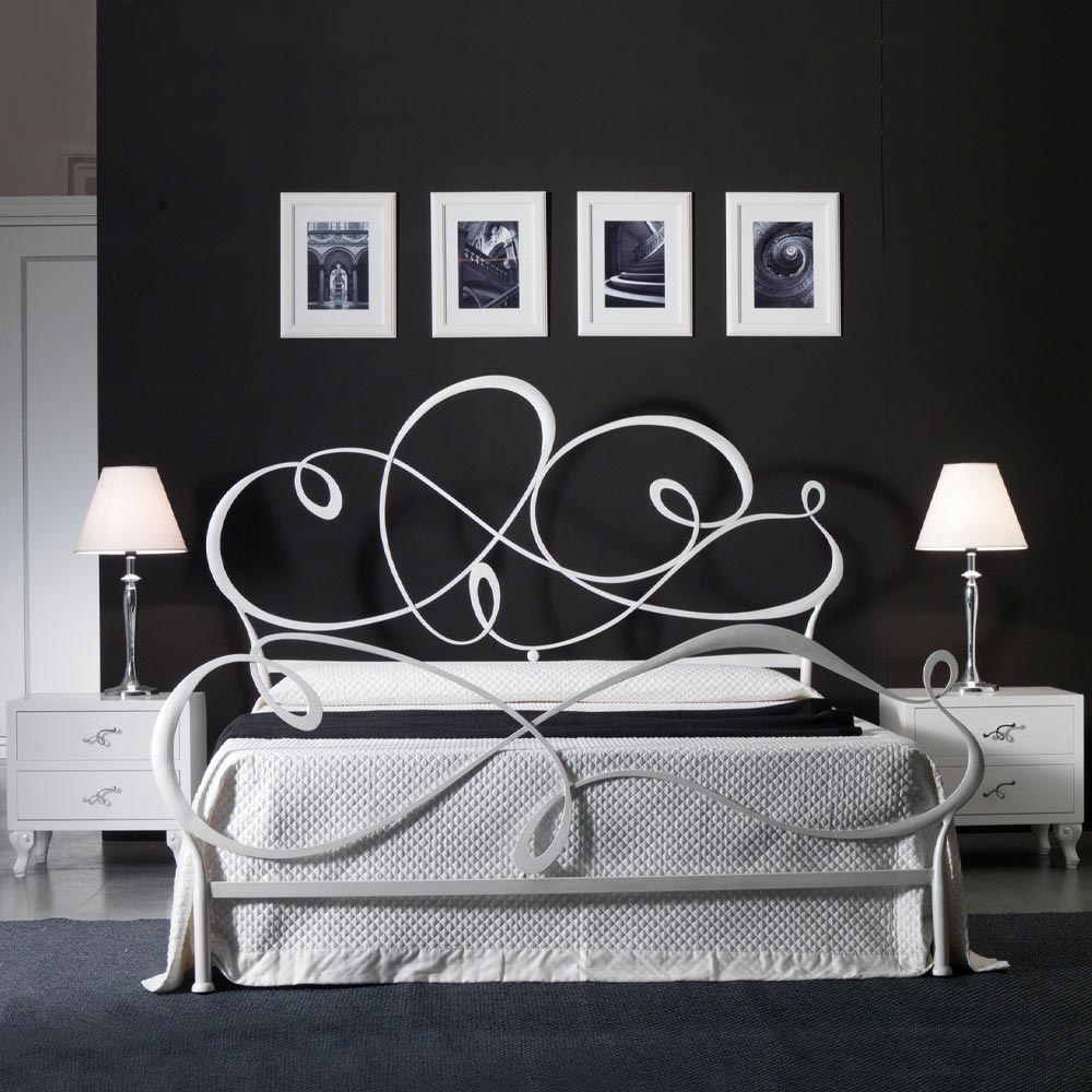 Tweepersoonsbed met ijzeren hoofdeinde en 2 nachtkastjes Made in Italy