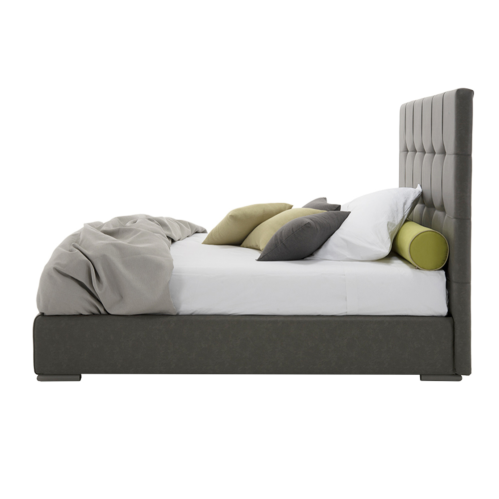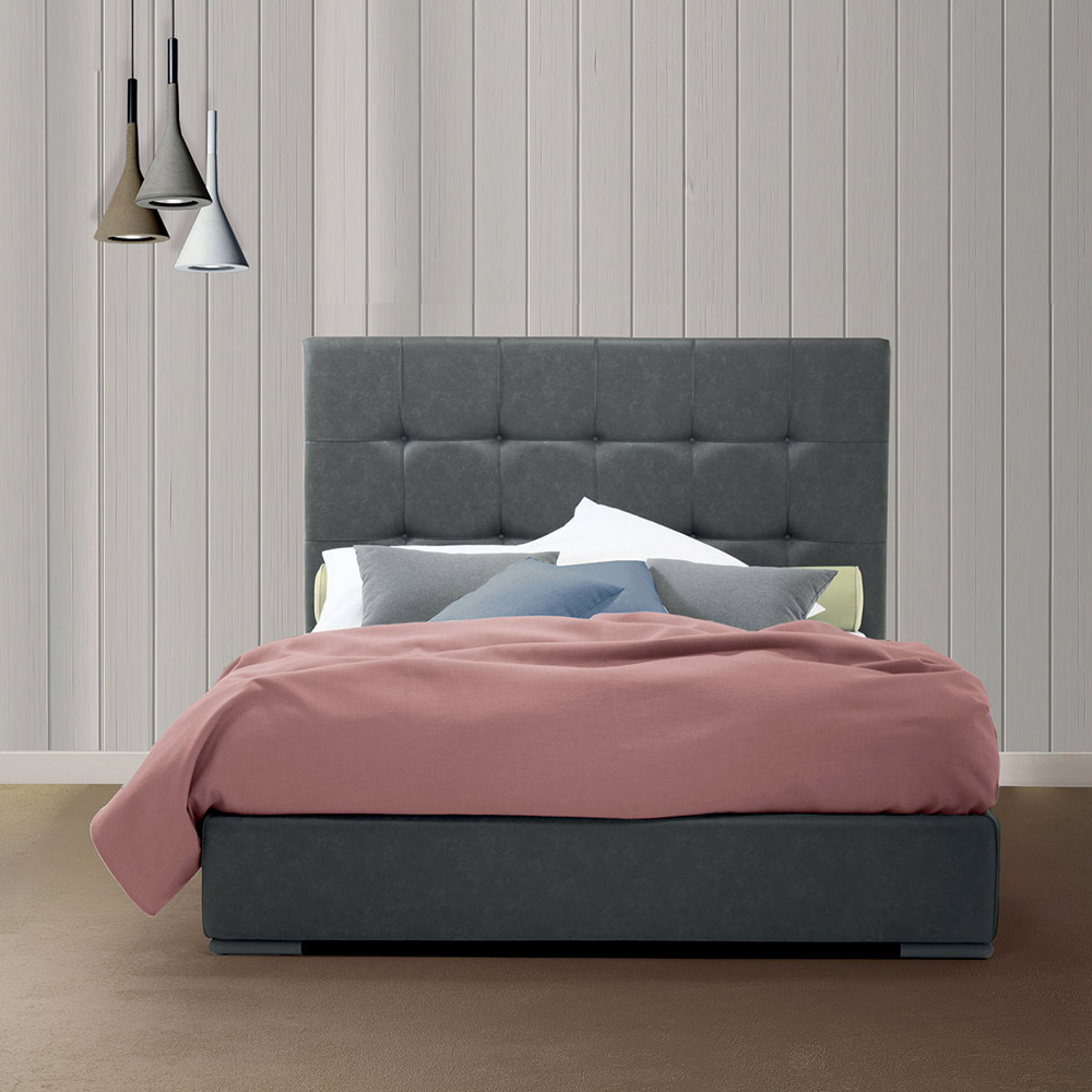 Hoogwaardig tweepersoonsbed met kingsize hoofdeinde en opbergdoos, handgemaakt in Italië van stof of eco-leer.