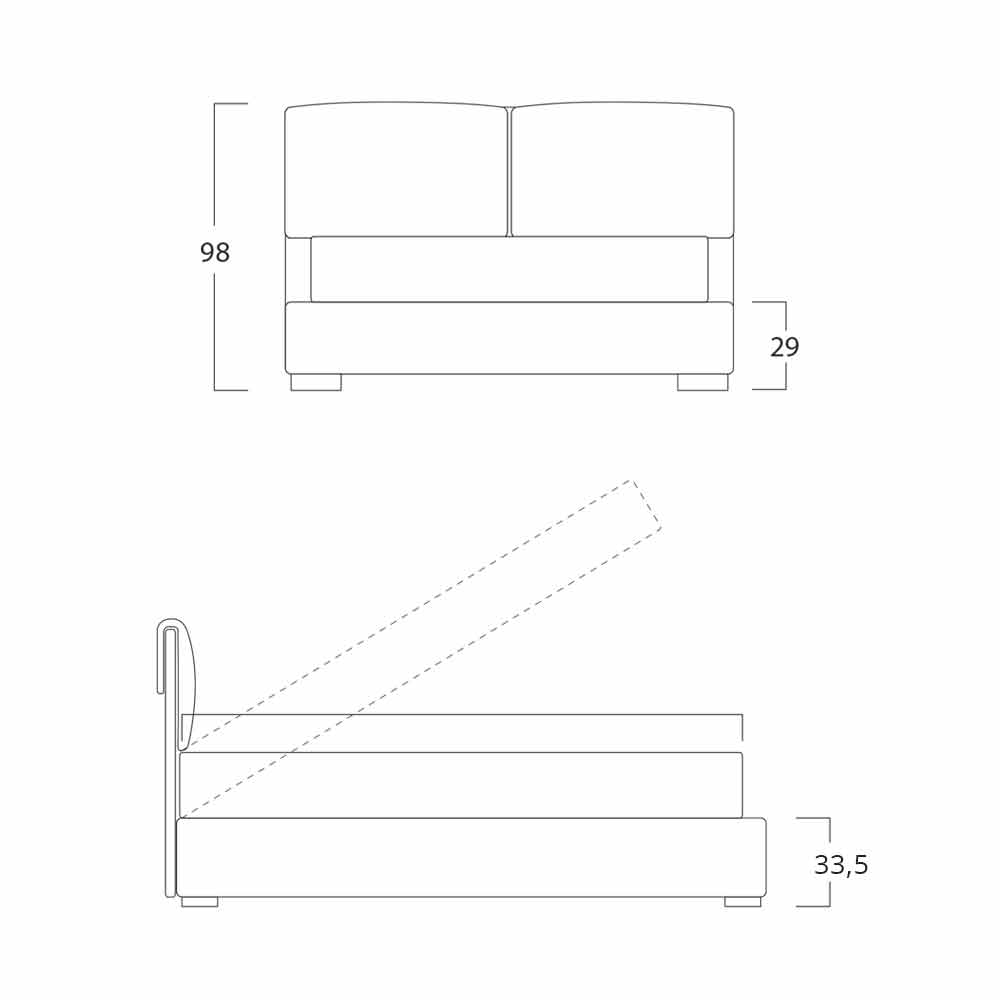 Structuur in stroken van sparrenhout met natuurlijke binnenafwerking h.29 cm, bekleed met polyurethaanschuim zonder chloorfluorkoolstoffen volgens UNI-normen en bekleed met lichtbestendig velfodera. De onderkanten van de structuur zijn van houtagglomeraat met synthetische binnenafwerking met sparreneffect, de laatste worden ondersteund door PE en buisvormige profielen. Lattenbodem met metalen structuur, gebogen frame met 50x37 mm profiel geverfd met epoxypoeders. Normale orthopedische lattenbodem, gebogen beuken multiplex latten.