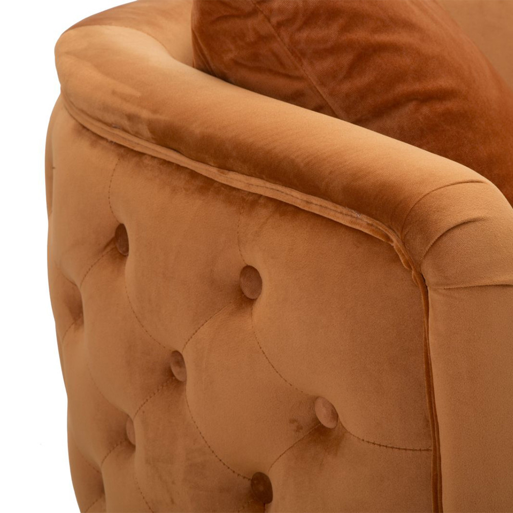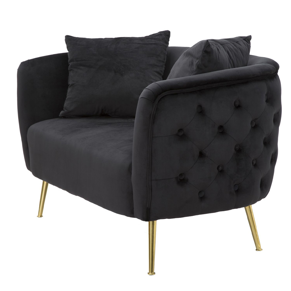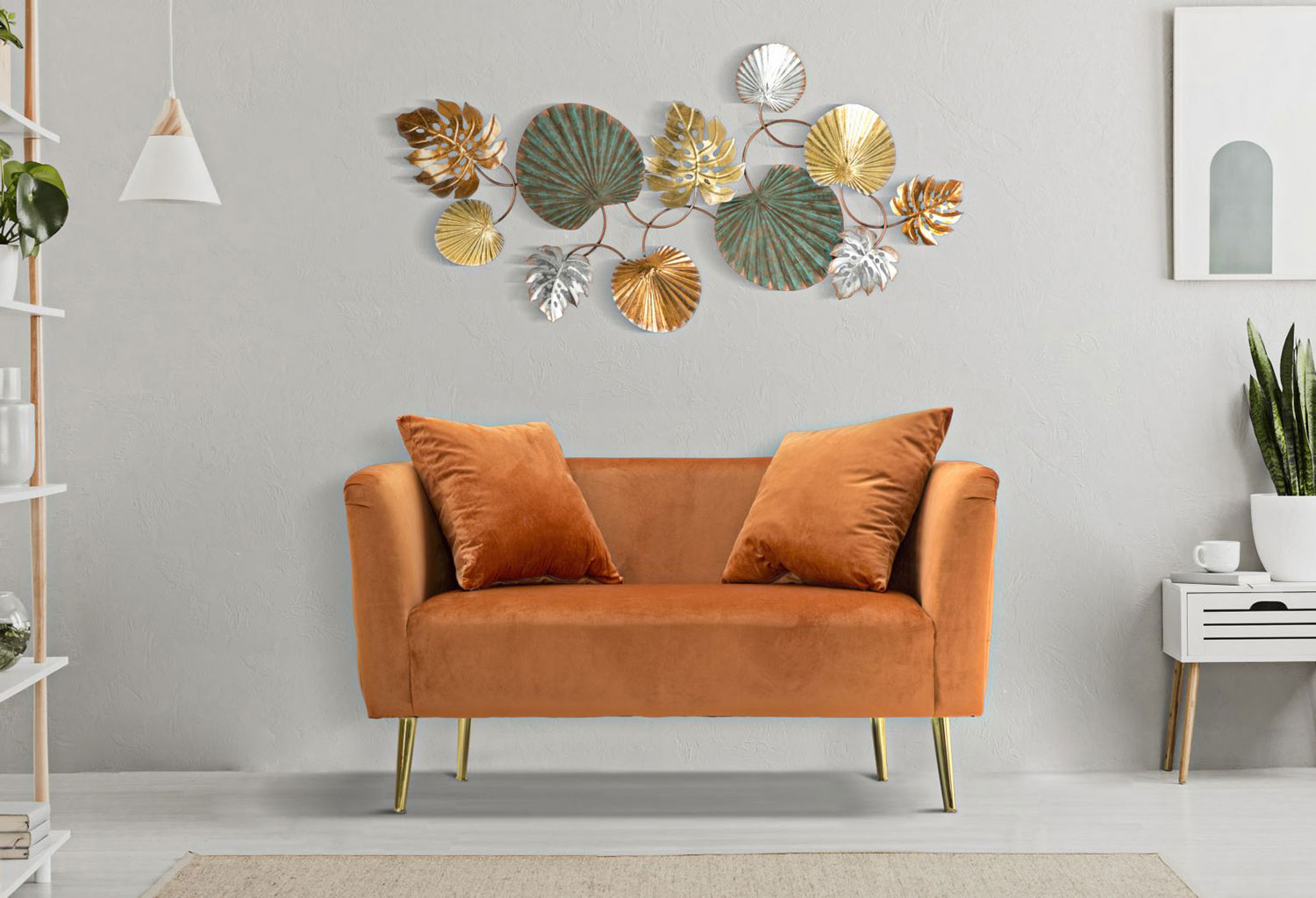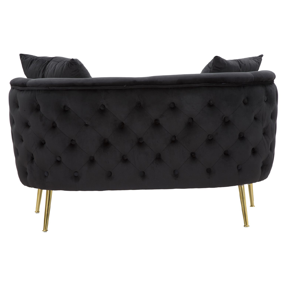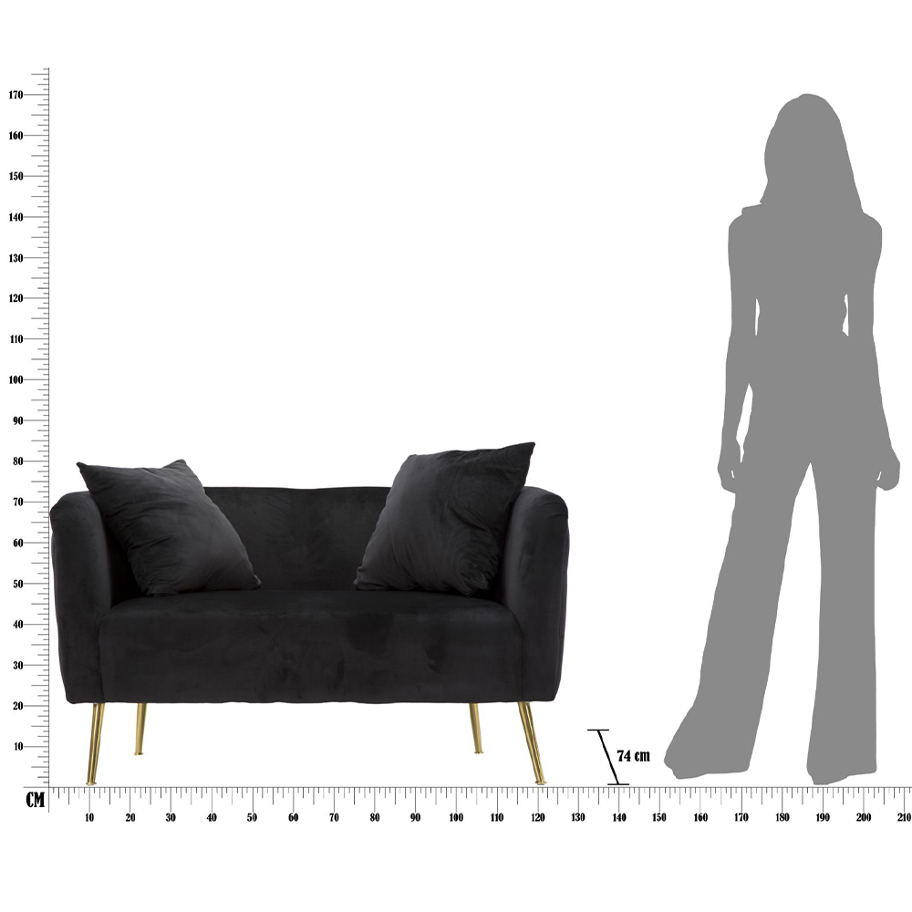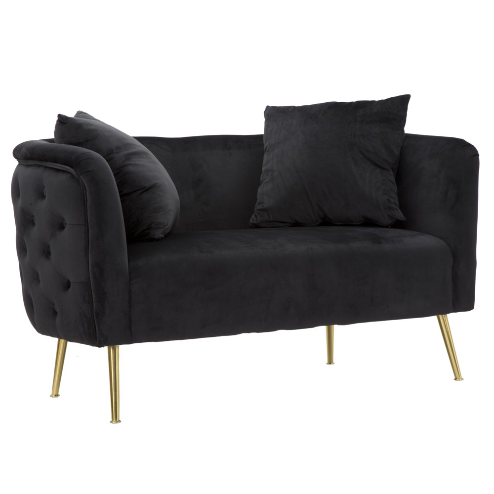 Moderne tweezitsbank in hout, ijzer en fluweel.