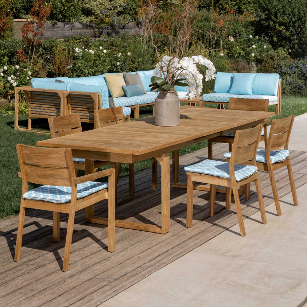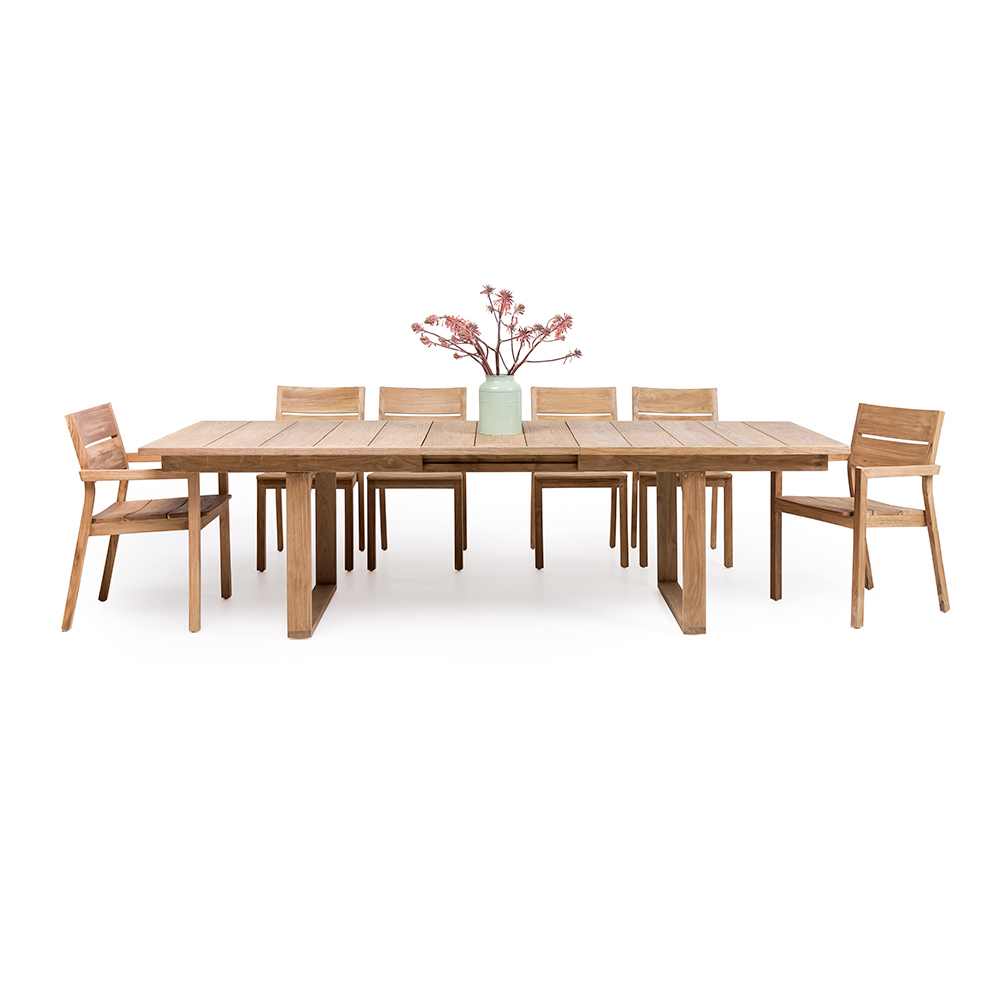 onderstel en blad van geborsteld natuurlijk teakhout, vier stoelen en twee fauteuils met armleuningen van geborsteld natuurlijk teakhout. De tafelconstructie wordt gekenmerkt door klassieke, vloeiende lijnen en de royale afmetingen van de houten delen. Deze