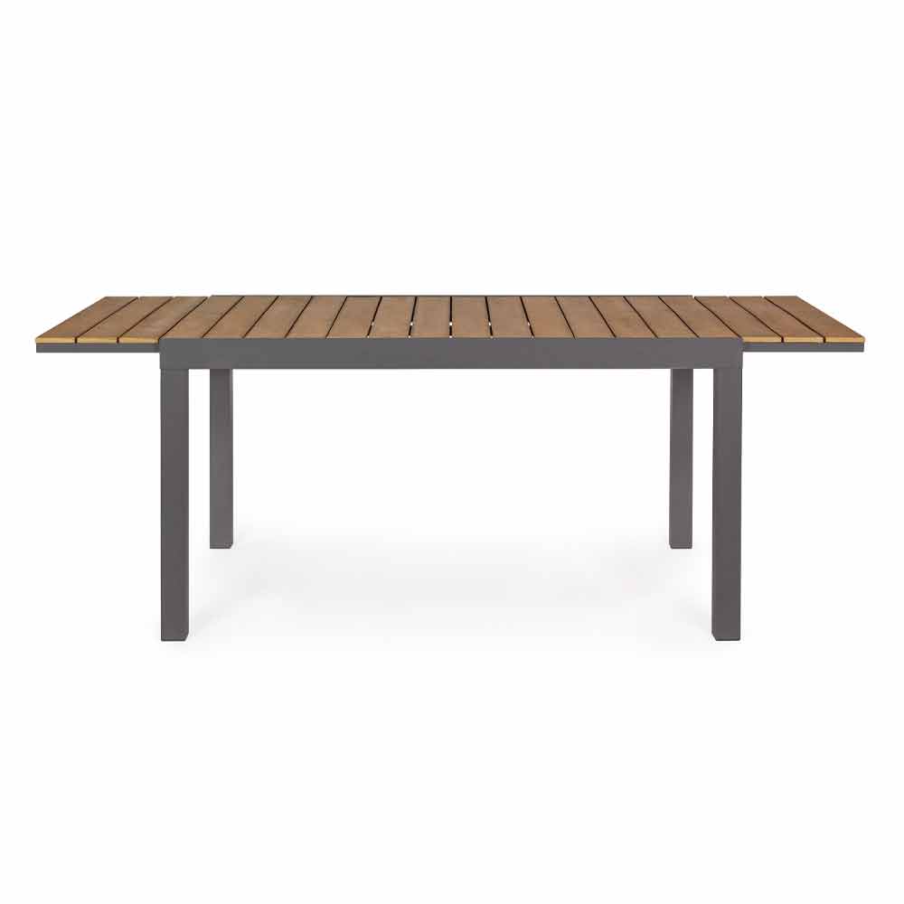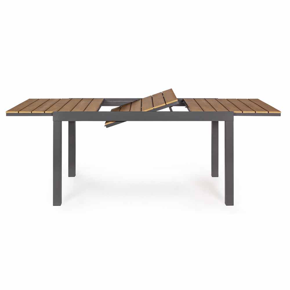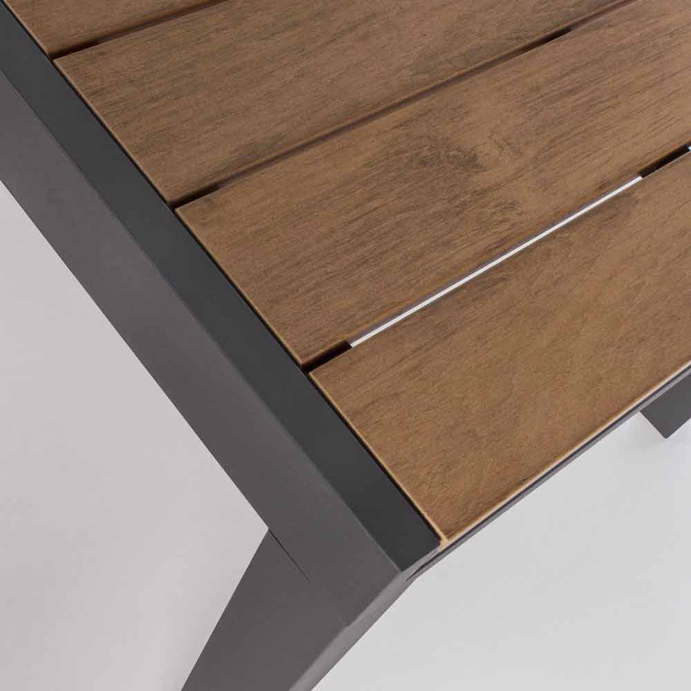 Gepoedercoate aluminium structuur (polyester). Blad in polywood (composietmateriaal met een gelijkaardige uitstraling als hout) 90% polystyreen 10% sbs teak kleur. Opklapbaar verlengstuk. Gegalvaniseerde stalen schroeven.