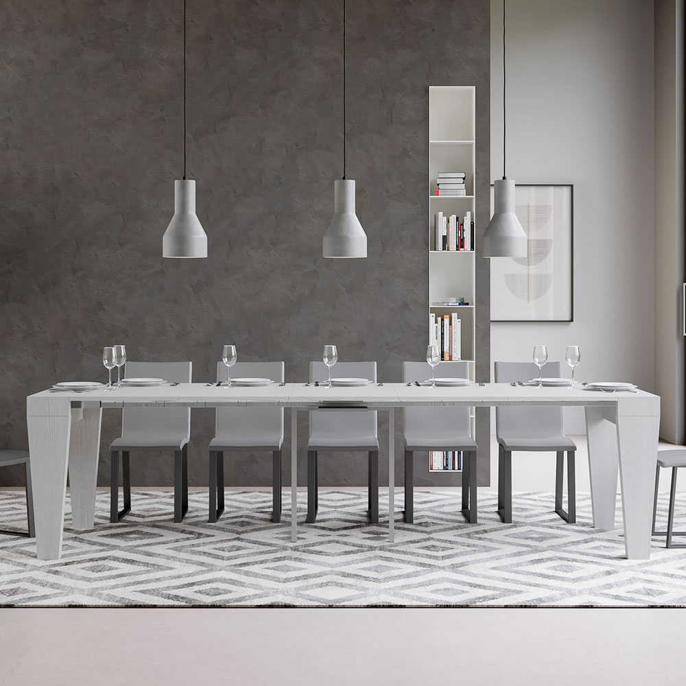 Deze uittrekbare consoletafel è ideaal voor het optimaliseren van de ruimte: compact in gesloten toestand, gemakkelijk uit te breiden tot een werkoppervlak of voor een etentje, wordt het een symbool van veelzijdigheid en aanpasbaarheid. È ontworpen voor wie op zoek is naar een combinatie van functionaliteit en sofistiche stijl in zijn meubilair.
