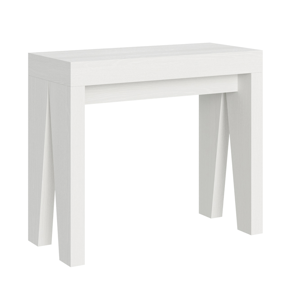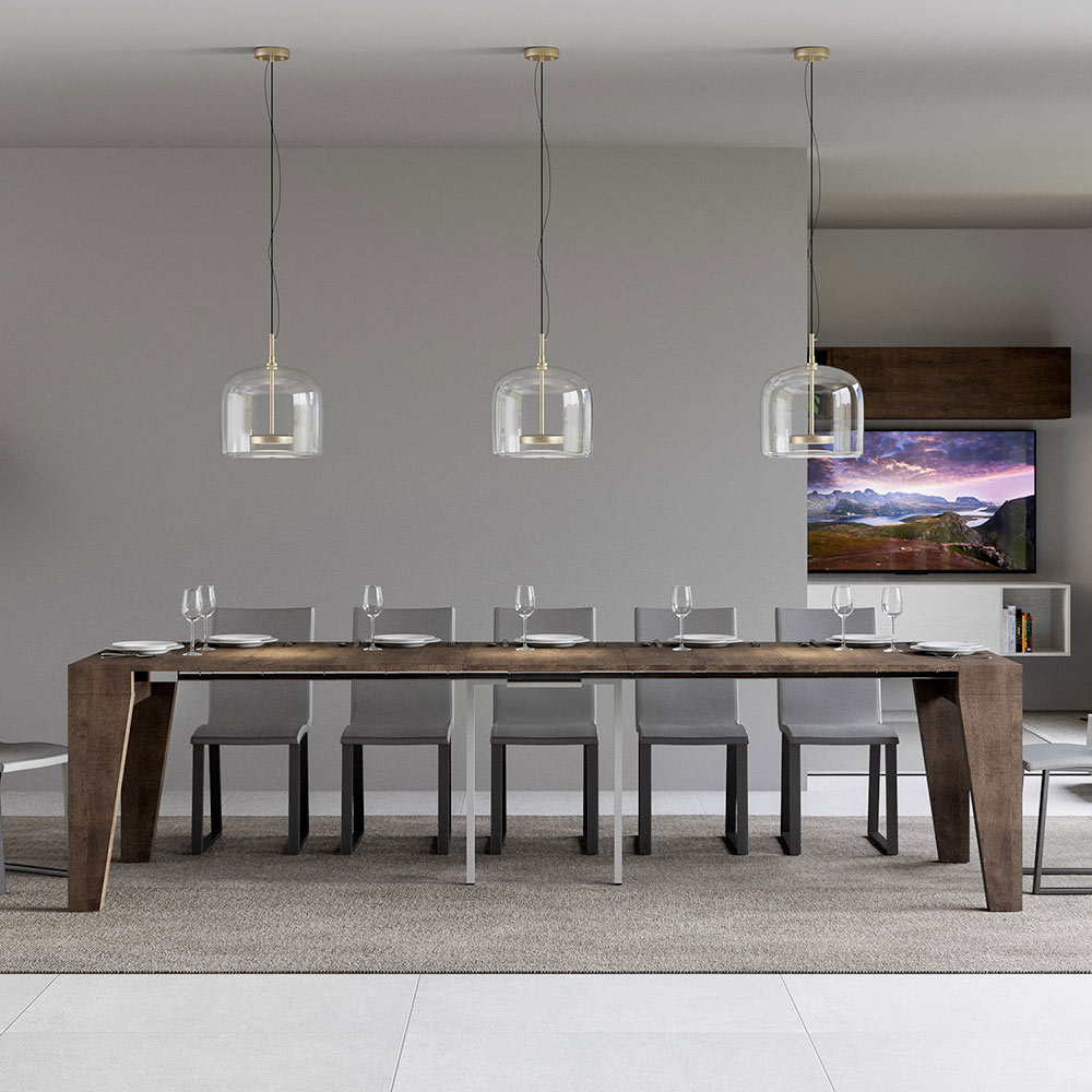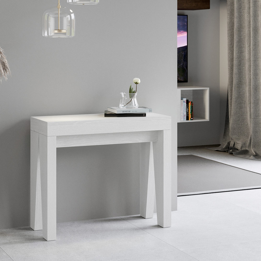 Deze uittrekbare consoletafel è ideaal voor het optimaliseren van de ruimte: compact in gesloten toestand, gemakkelijk uit te breiden tot een werkoppervlak of voor een etentje, wordt het een symbool van veelzijdigheid en aanpasbaarheid. È ontworpen voor wie op zoek is naar een combinatie van functionaliteit en sofistiche stijl in zijn meubilair.