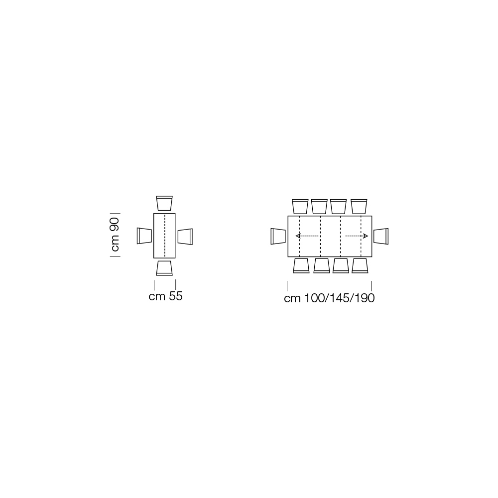 Maatregelen- L 55 (190) x D 90 x H 77 cm 10-zits uitschuifbaar met drie externe verlengstukken van elk 45 cm;