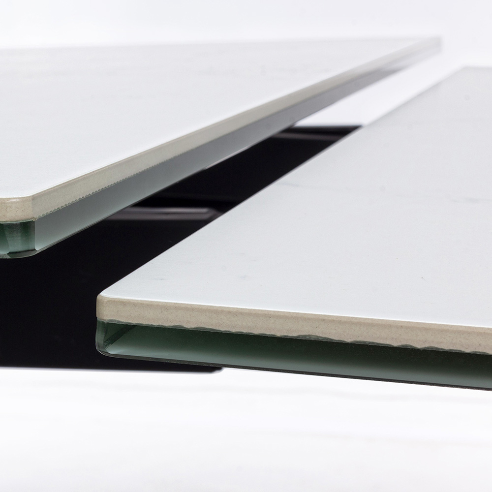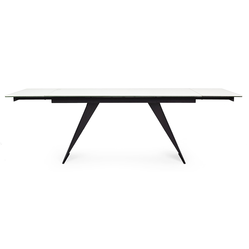 Uitschuifbare eettafel in staal en blad in keramiek en glas.