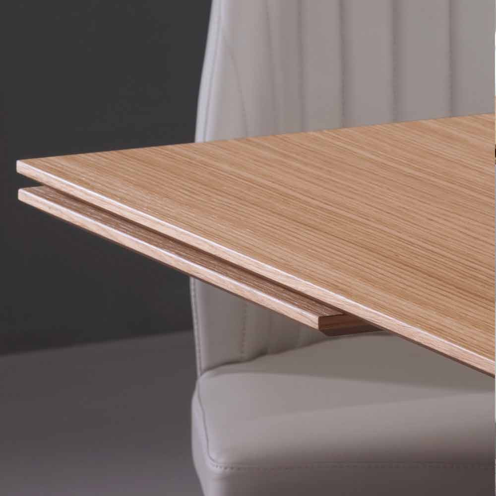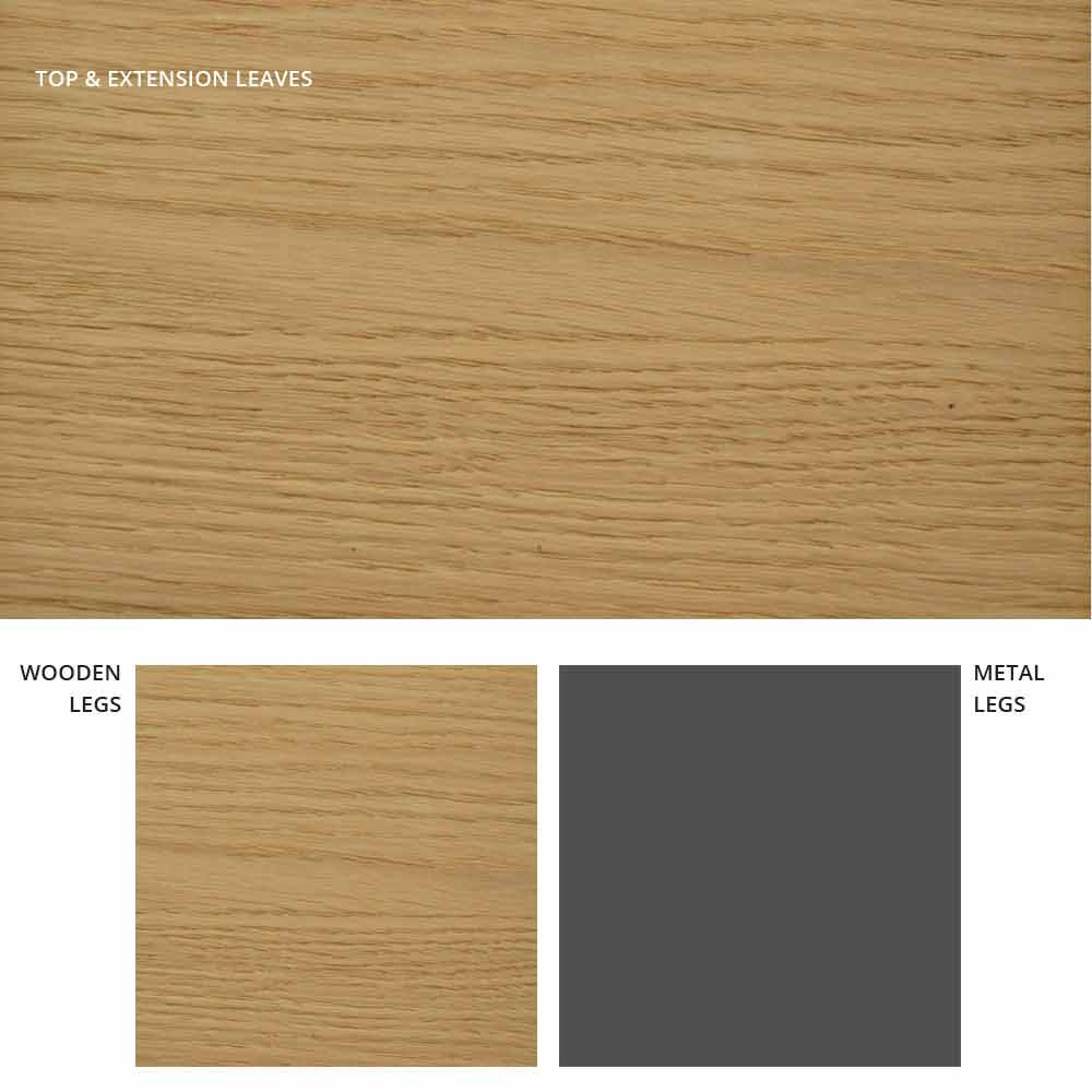 Het blad en de verlengstukken van Daryl zijn gefineerd met natuurlijk eikenhout. Het blad heeft bovendien een 45° uitlopende rand.