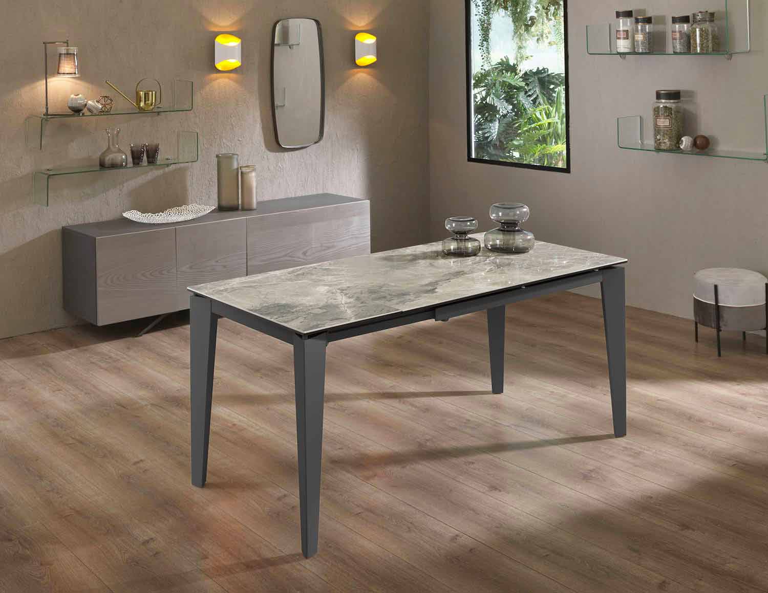 Syrta is een rechthoekige eettafel die wordt gekenmerkt door de mogelijkheid om te worden verlengd tot 170 cm om, indien nodig, meer ruimte aan tafel te krijgen en bijgevolg meer comfort, ideaal voor het ontvangen van vrienden en familie zonder in te boeten aan comfort. De tafel is gemaakt met een geverfde metalen structuur en een keramisch blad op antracietkleurig gehard glas dat de tafel elegant en tegelijkertijd bestendig maakt en is ook compleet met interne verlengstukken, ook keramiek op wit glas.
