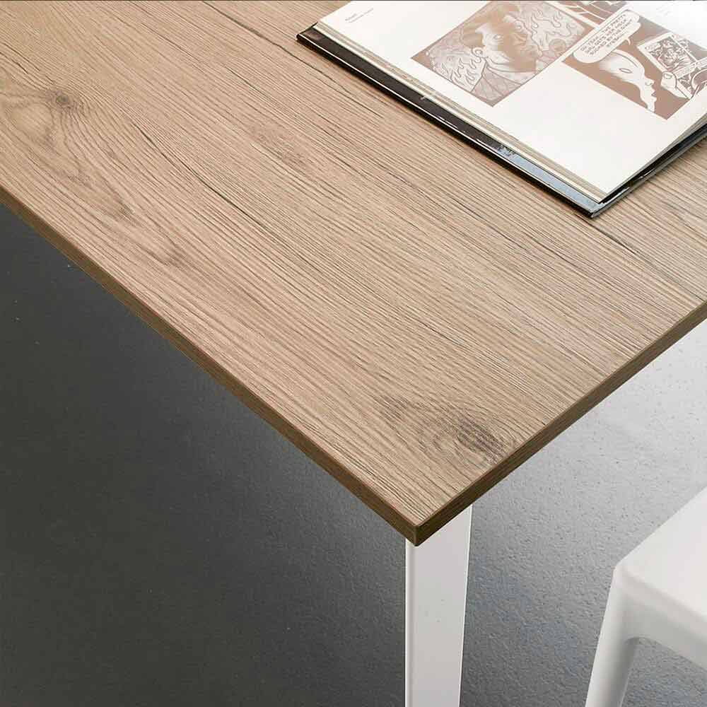 Eettafel gemaakt in Italië met melamine blad (dikte 20 mm) met schorsafwerking, verlengstuk in melamine passend bij het blad en onderstel in wit geverfd metaal .