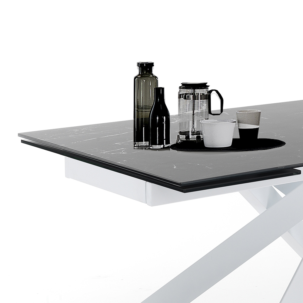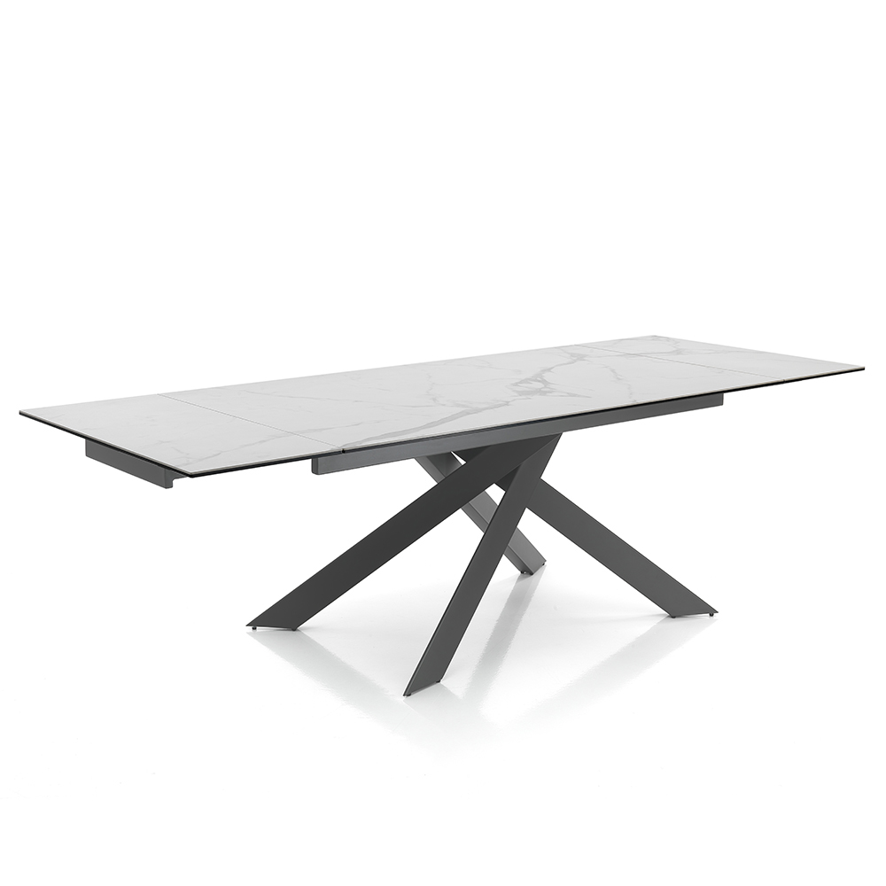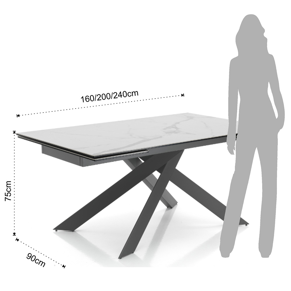gelakte stalen structuur . Dankzij de twee verlengstukken van elk 40 cm onder het blad, kan de tafel een maximale lengte van 240 cm bereiken, waardoor er meer gasten kunnen komen voor heerlijke lunches en diners met vrienden. De perfecte combinatie van de elegantie van het keramiek en het imposante detail van het stalen onderstel creëert een meubel met een