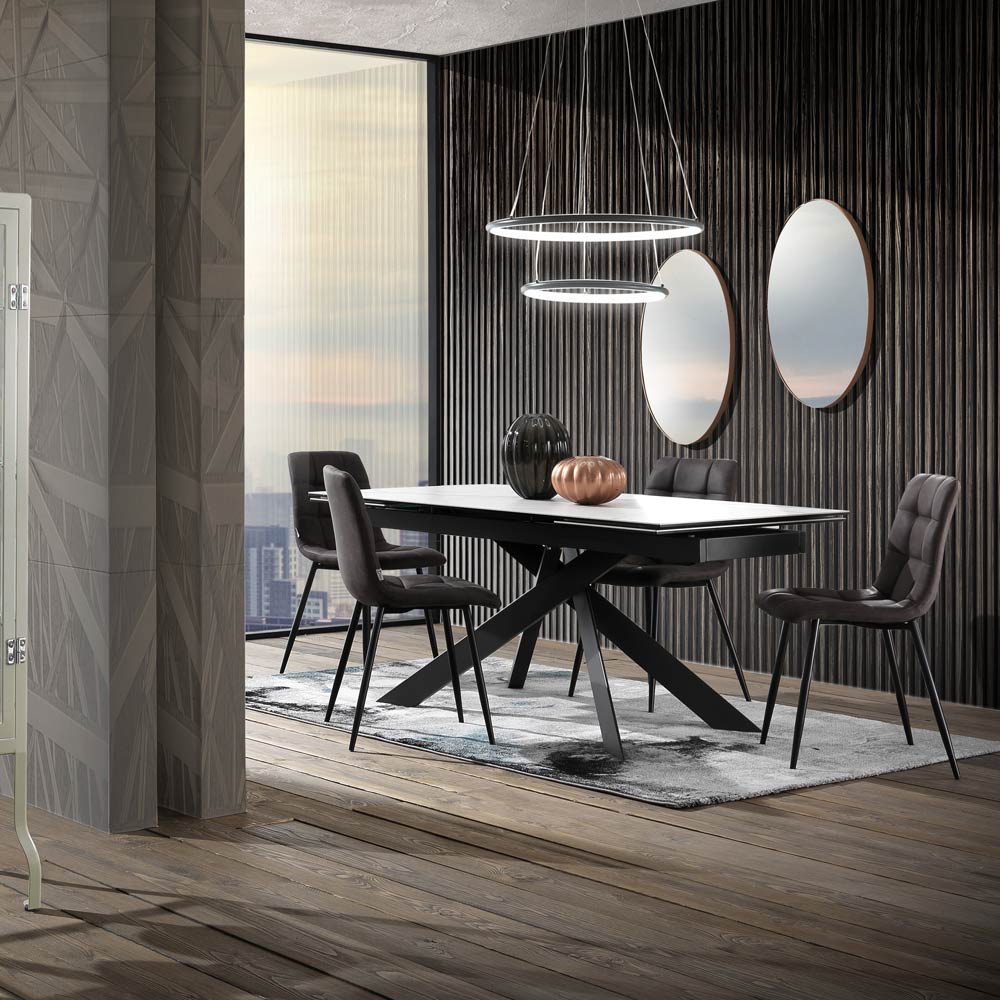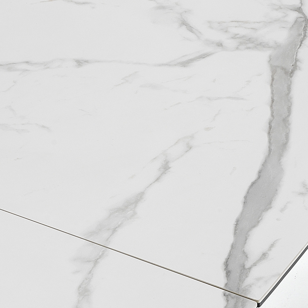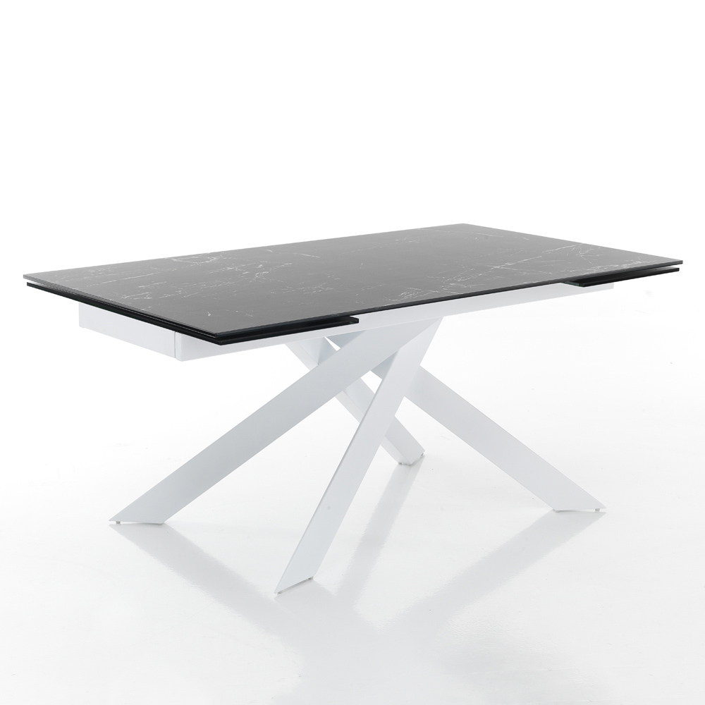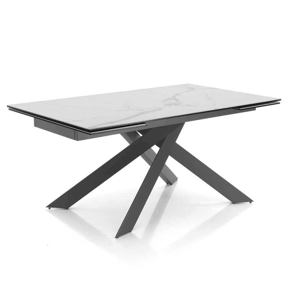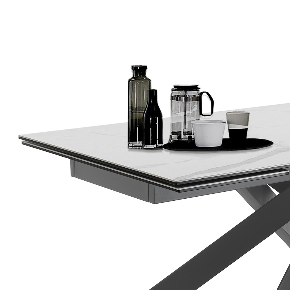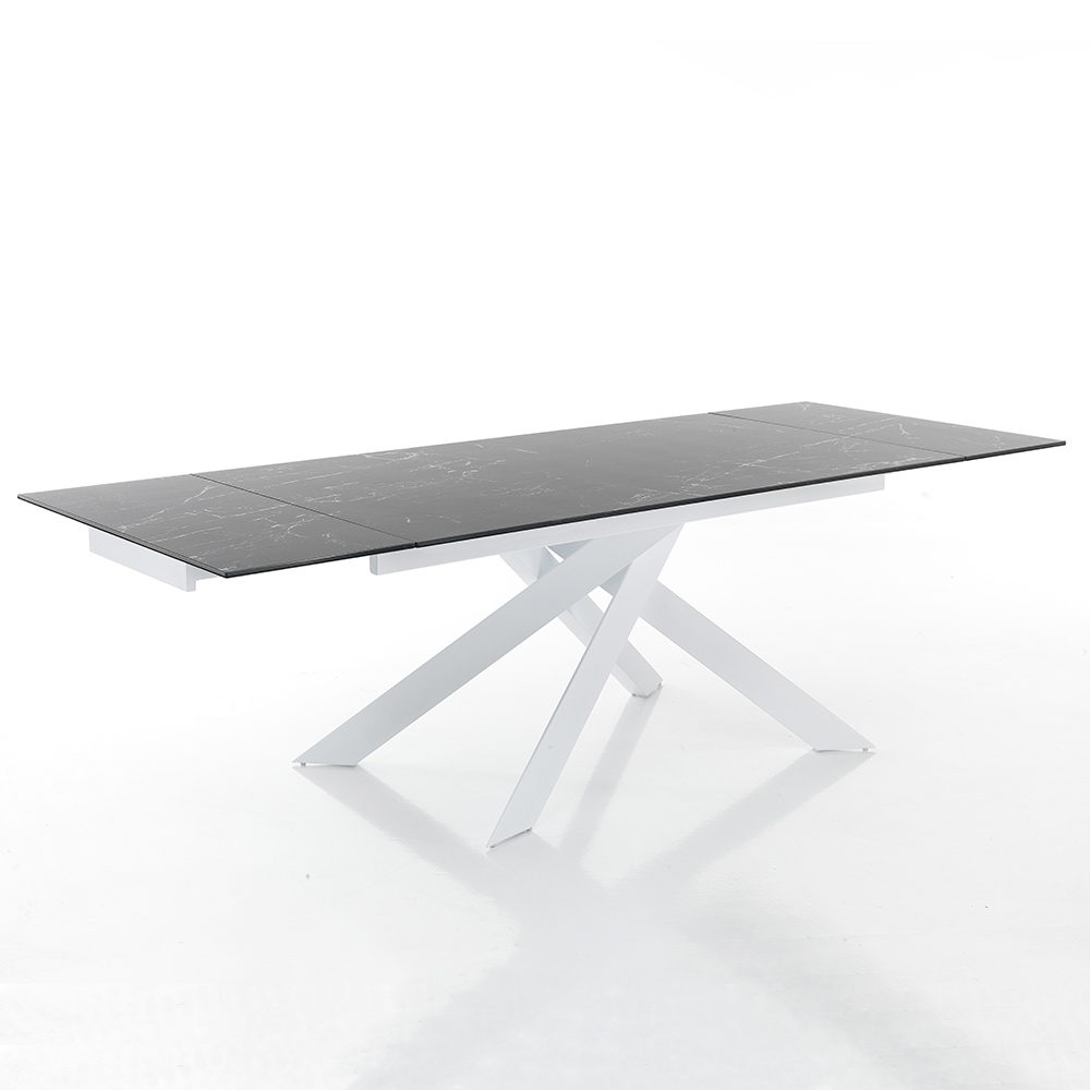 Uitschuifbare eettafel van keramiek met marmer- en staaleffect.