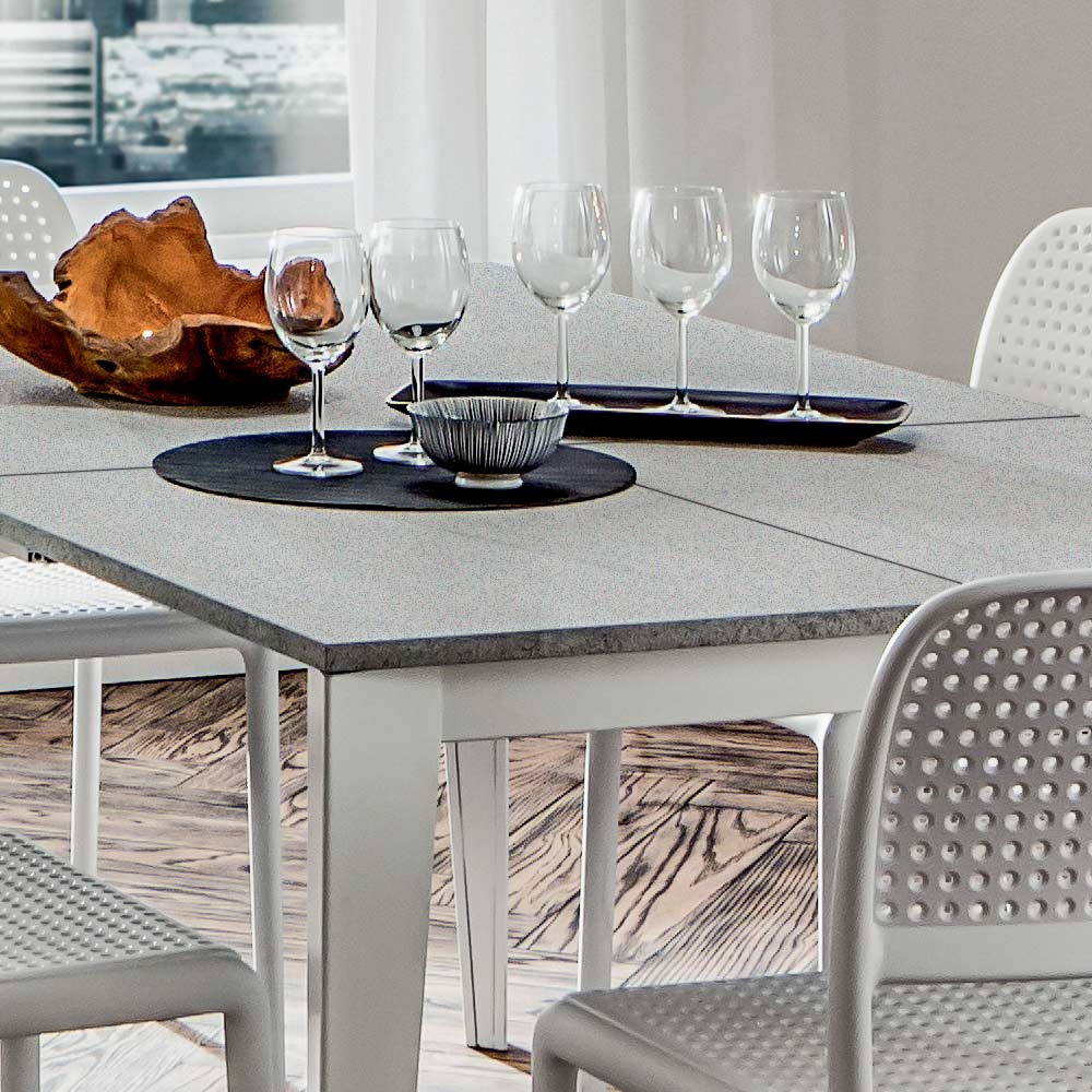 metalen onderstel gelakt met epoxypoeders, witte afwerking. Een elegante en discrete tafel met een klein vierkant blad dat indien nodig kan worden omgevormd tot plaats voor maximaal 10 personen. Een bijzonder geschikte oplossing voor wie graag gasten thuis ontvangt voor heerlijke lunches en diners in gezelschap. Dit kenmerk vertegenwoordigt zijn ware bijzonderheid, want dankzij de