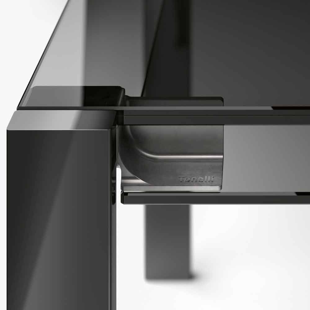 Uitschuifbare eettafel tot 280 cm met glazen blad en metalen onderstel Made in Italy.