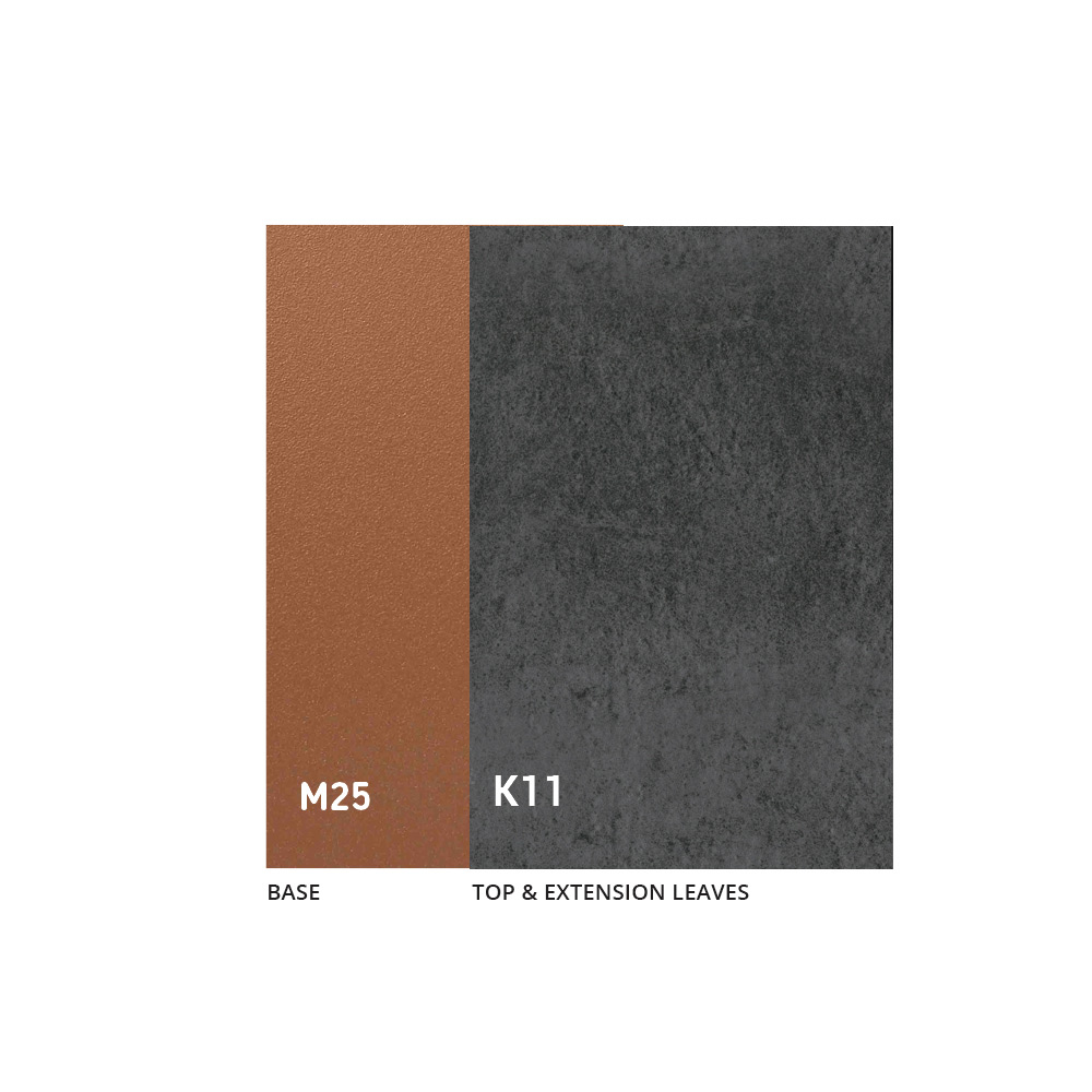 Tafel gemaakt van een metalen frame met reliëf en koperverf en een 3 mm dik keramisch tafelblad.