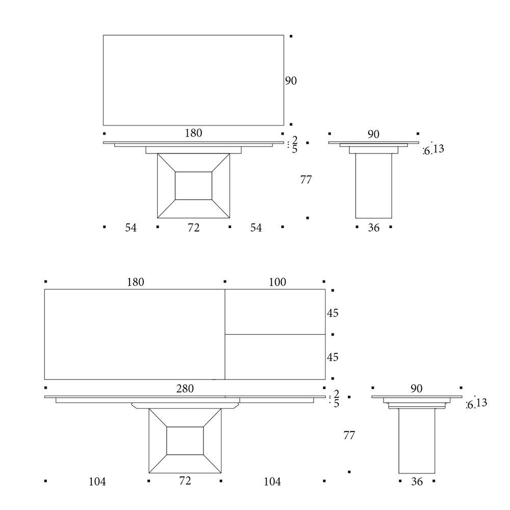 Het blad is uitschuifbaar met een metalen frame, een telescopisch mechanisme en een gesynchroniseerde opening. De interne extensie schuift uit als een boek. De extensie schuift uit met een doorlopende nerf.