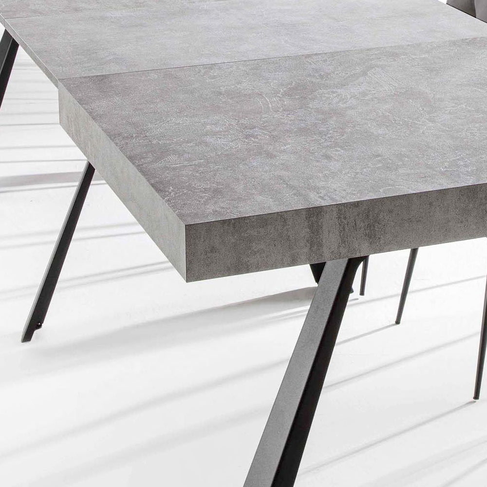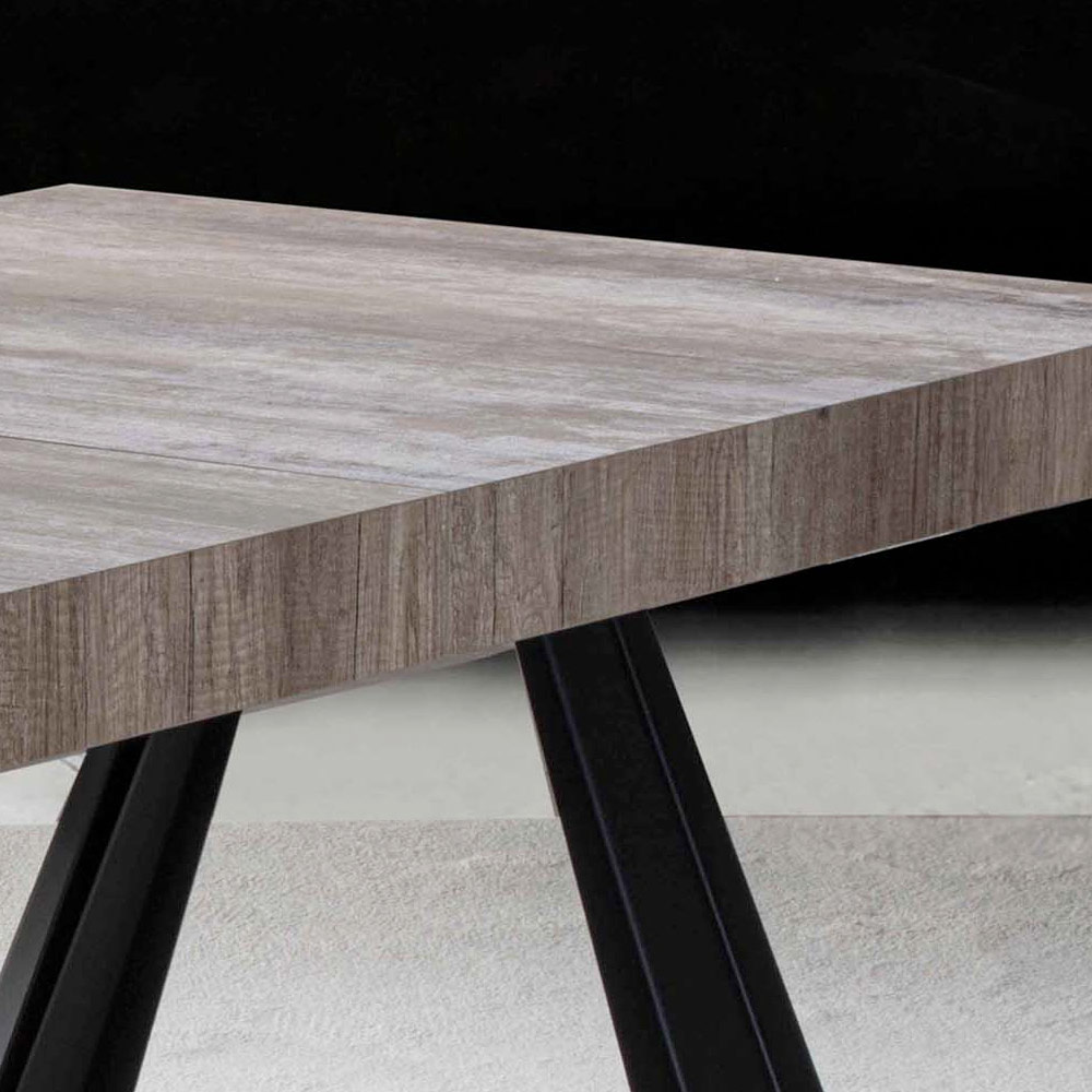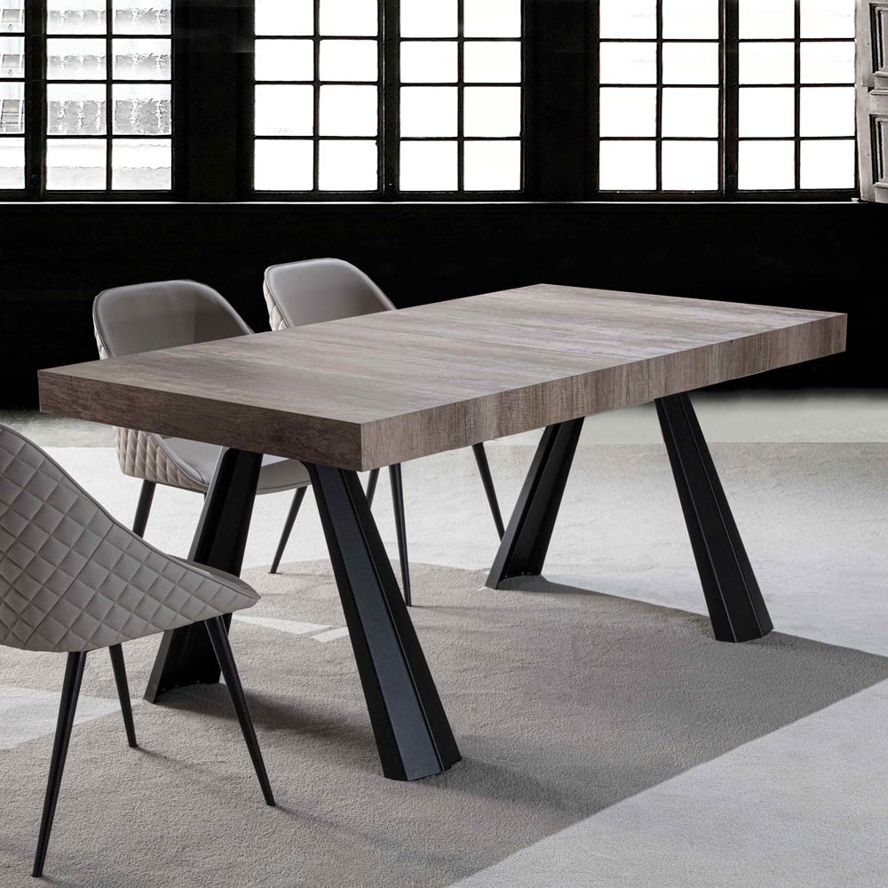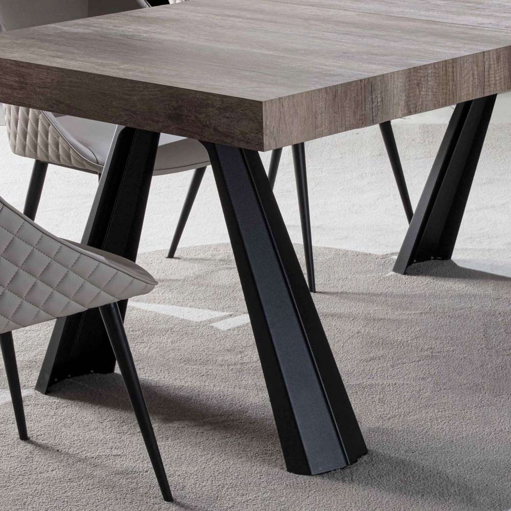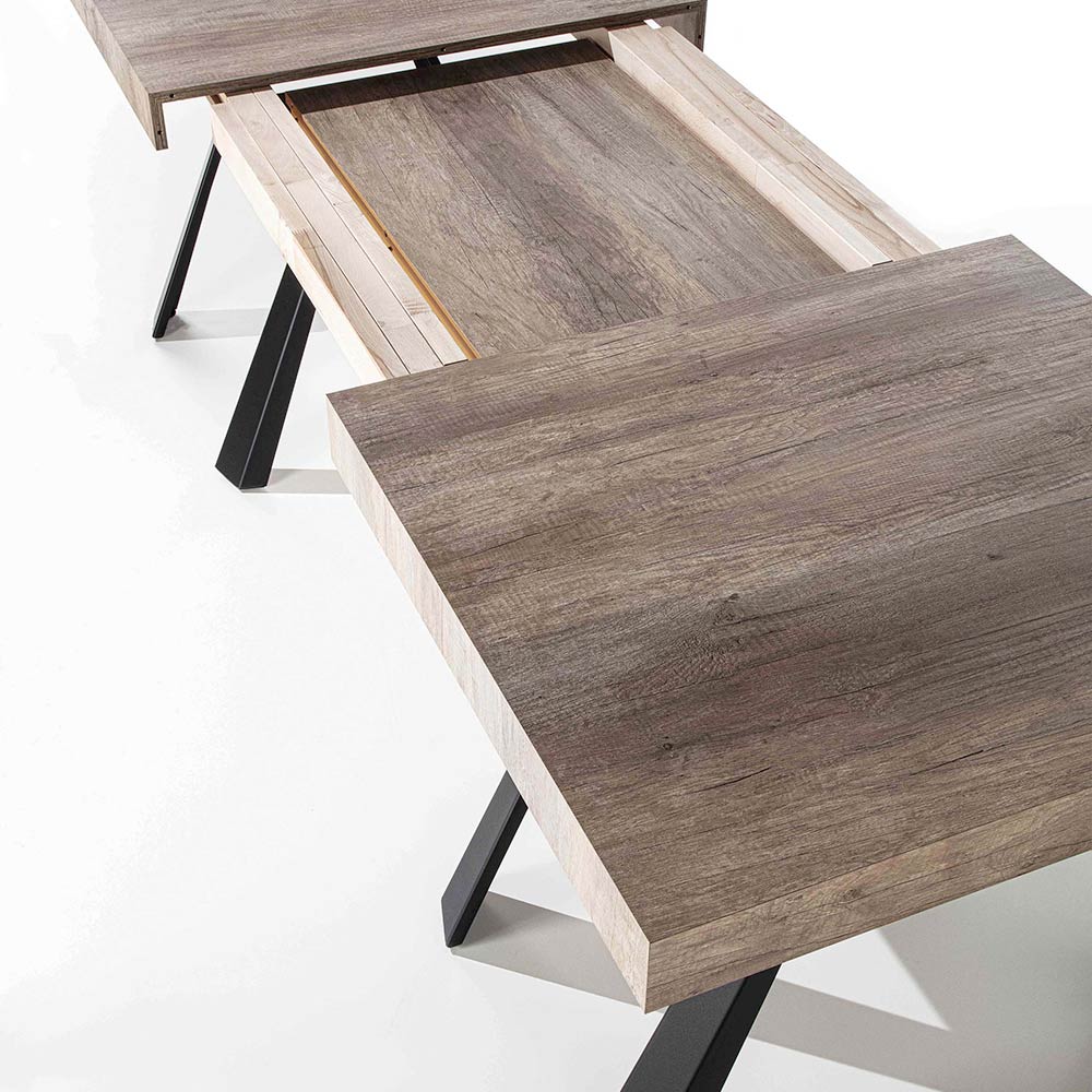 Uitschuifbare eettafel tot 500 cm in melamine hout en gelakt metaal.