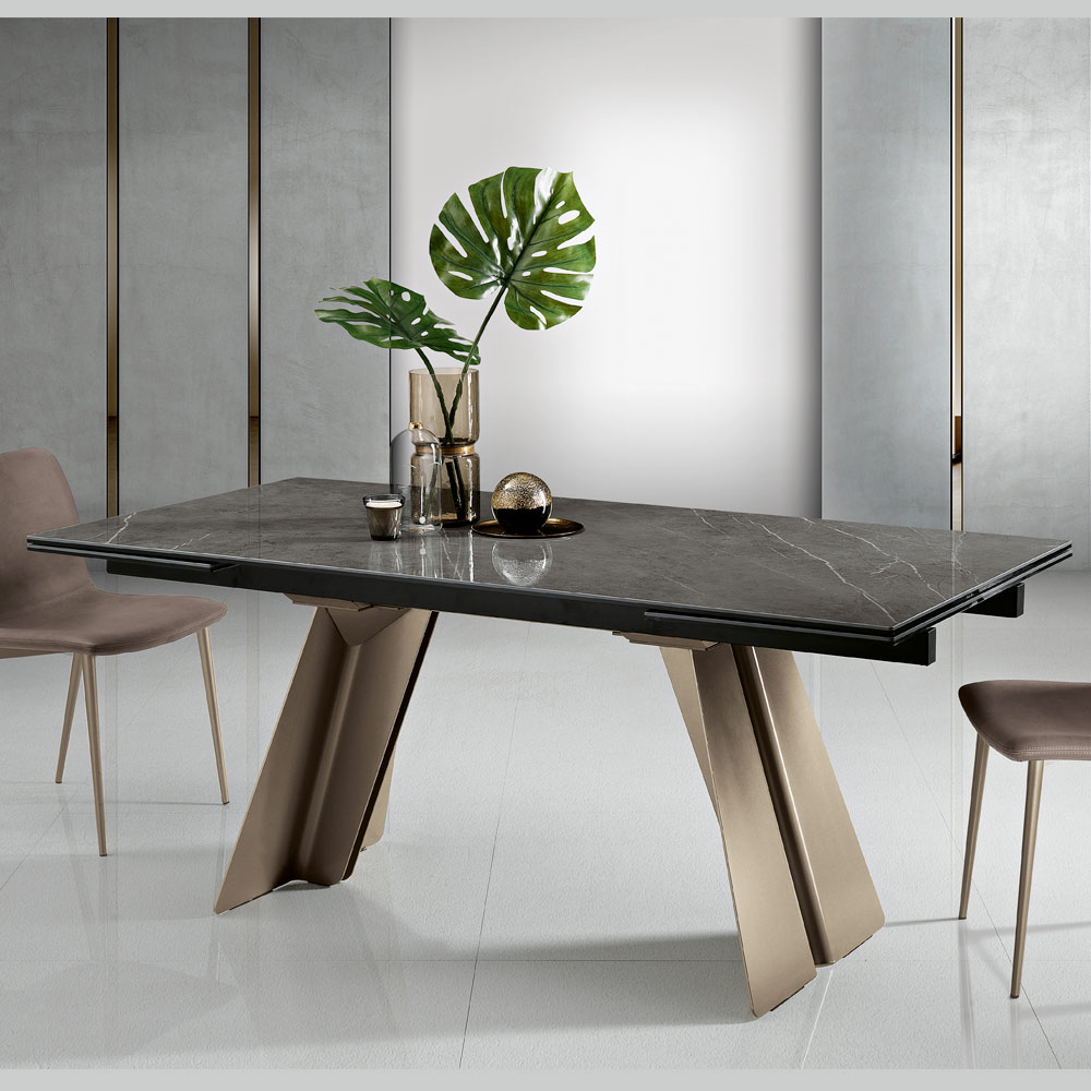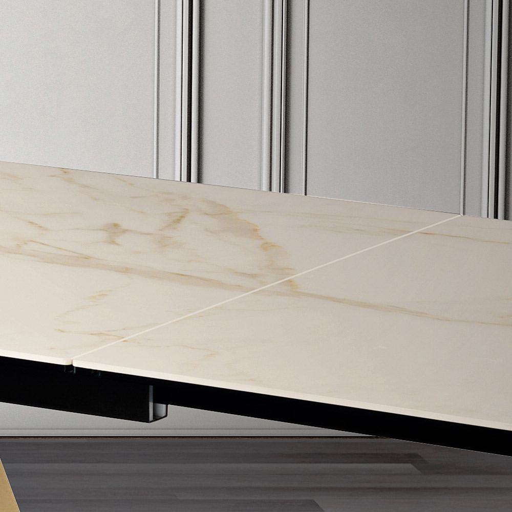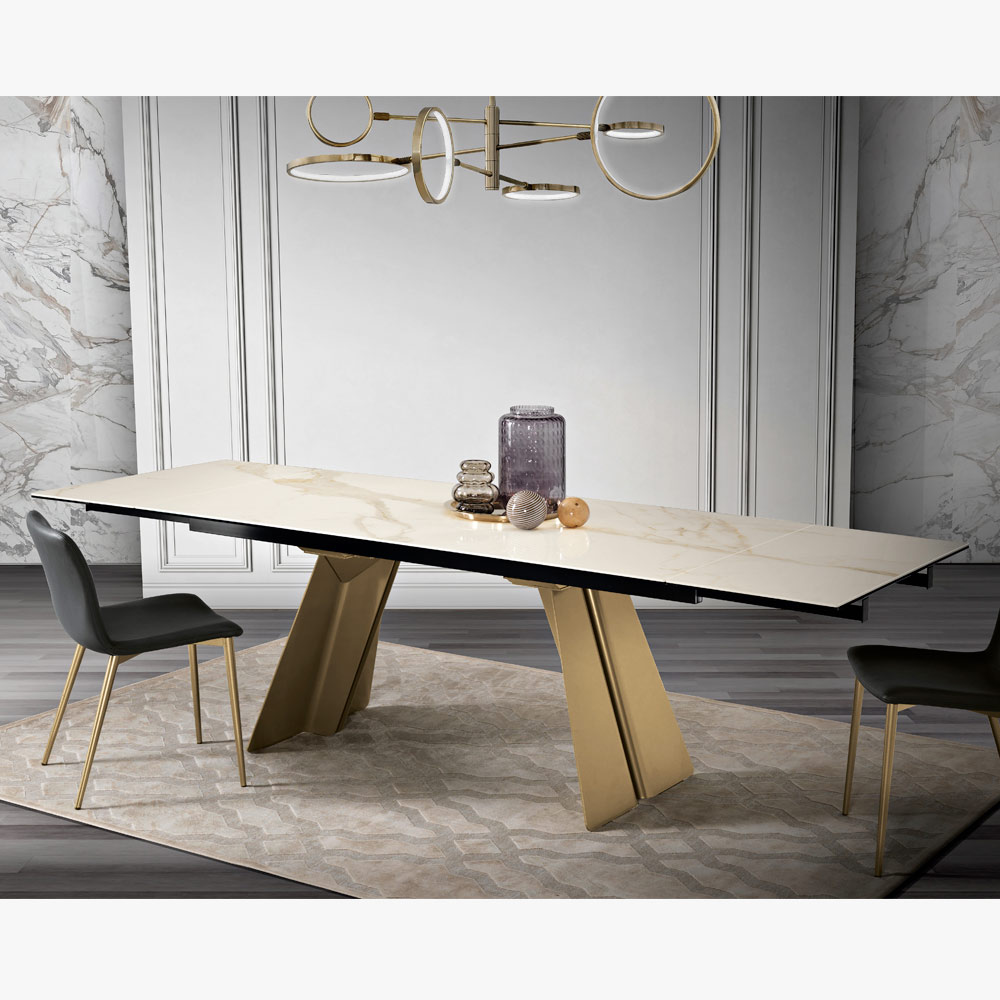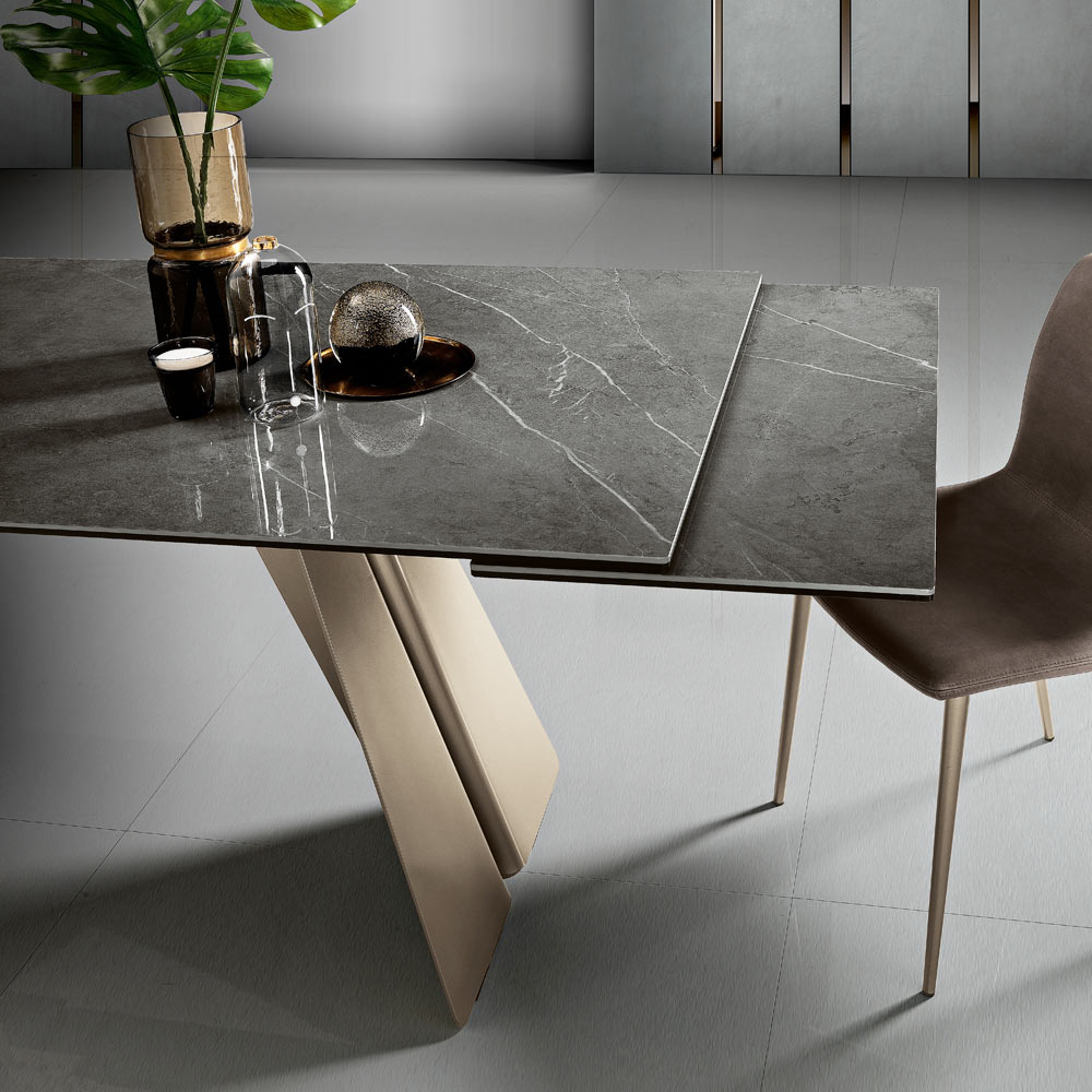 Deze creatie is veel meer dan een uitschuifbare tafel : het is een kunstwerk dat elke omgeving definieert met zijn scenografische aanwezigheid. Het oppervlak spreekt de taal van luxe en natuur en belooft elke maaltijd tot een evenement te maken.