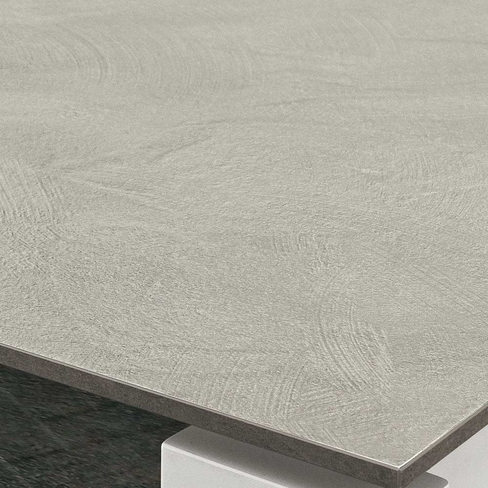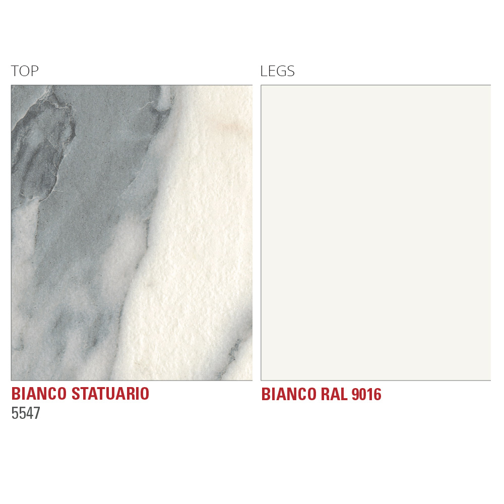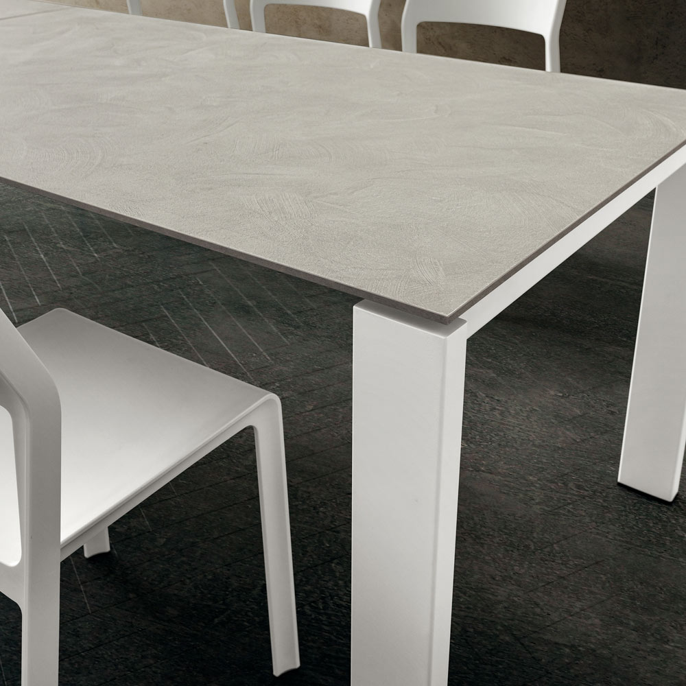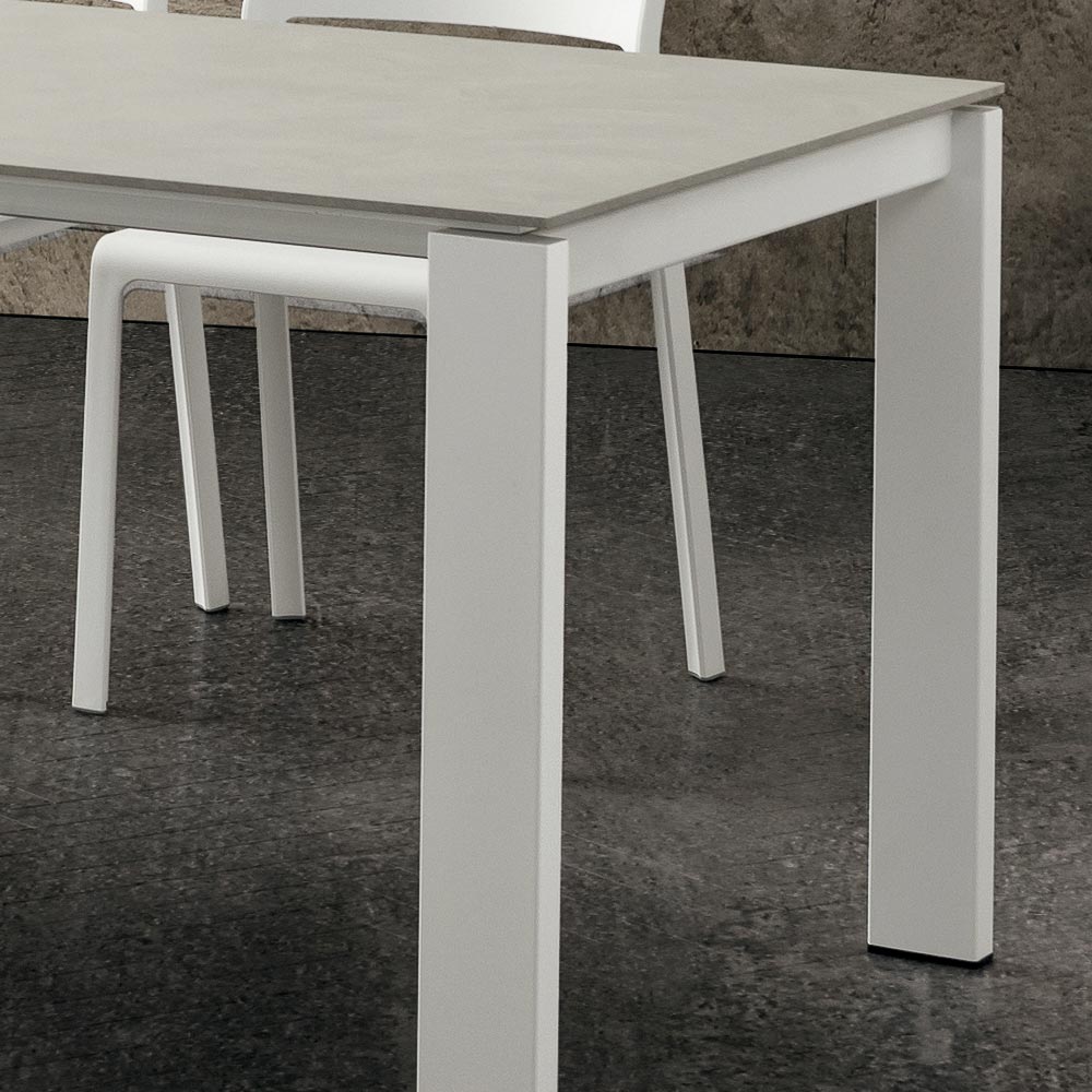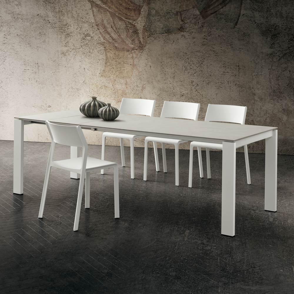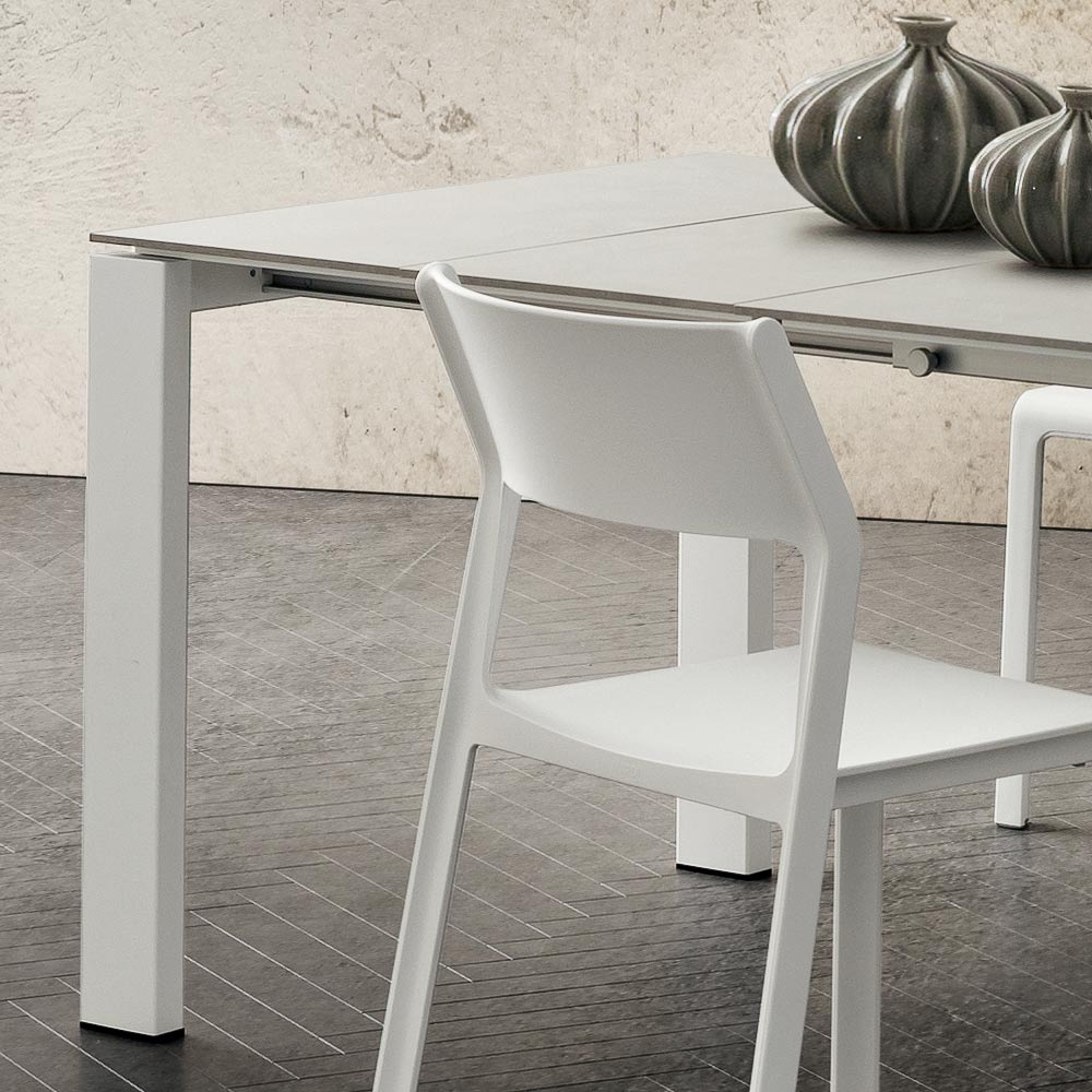 Uitschuifbare eettafel van hoogwaardig Made in Italy hpl en wit gelakt metaal.