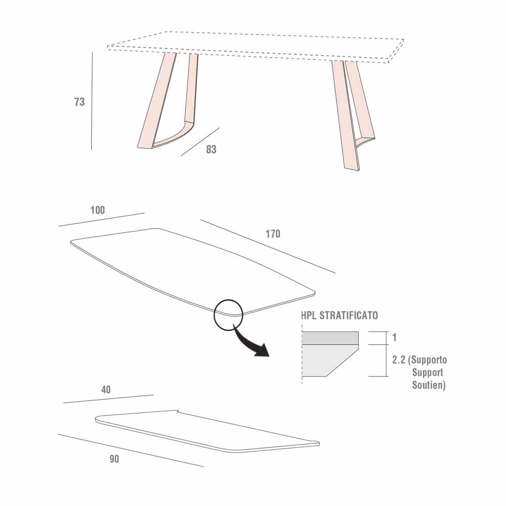 eenvoudige en exclusieve lijnen waarvan de esthetiek wordt onderstreept en uniek wordt gemaakt door de ongebruikelijke vorm van de poten en de bijzondere tonvorm van het blad, elementen die de originaliteit en elegantie vergroten. Dankzij de twee