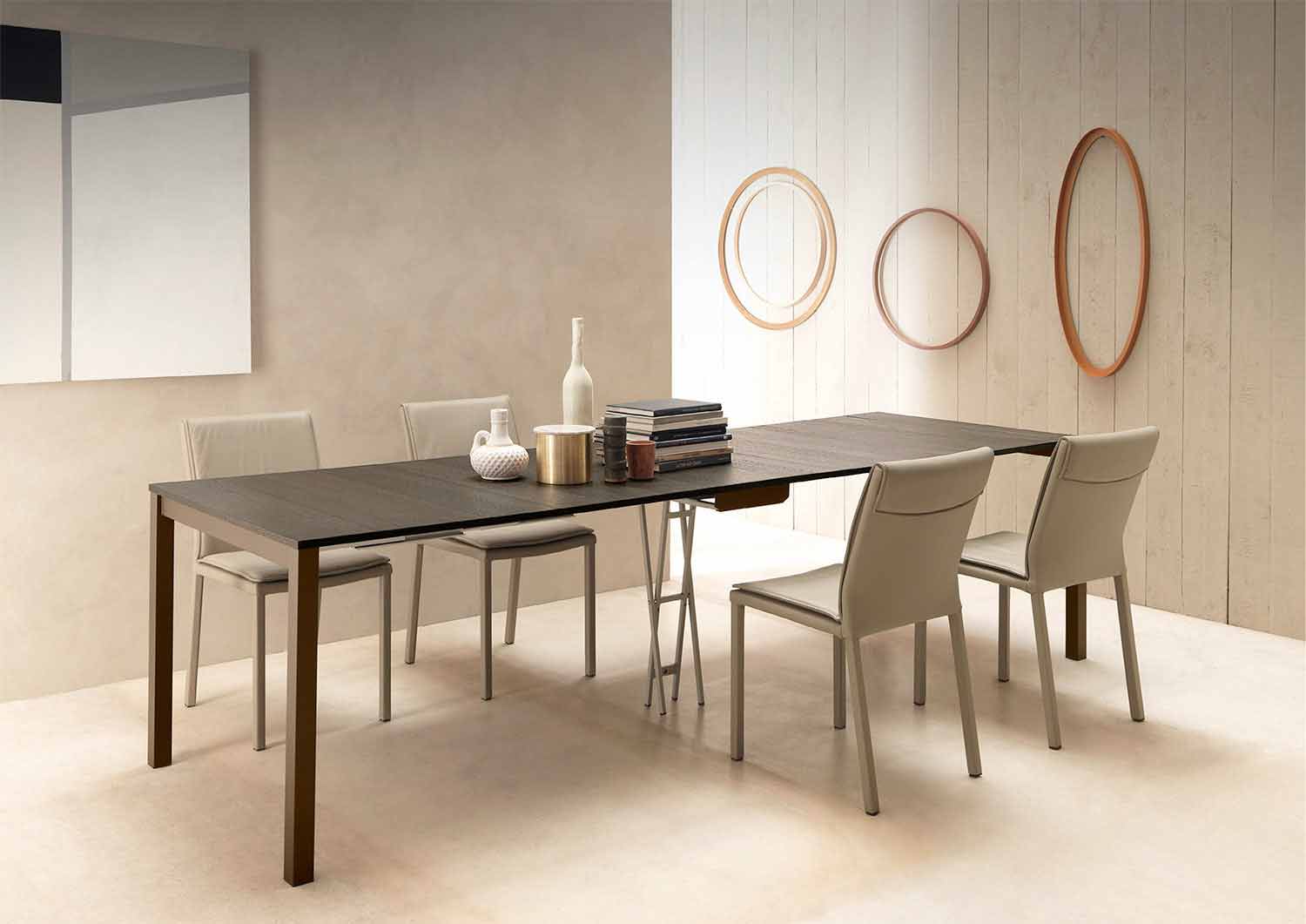 verkrijgbaar met maximaal 3 of 5 verlengstukken van 50 cm in dezelfde afwerking als het blad, voor maximaal 12 gasten, met centrale steunpoten.