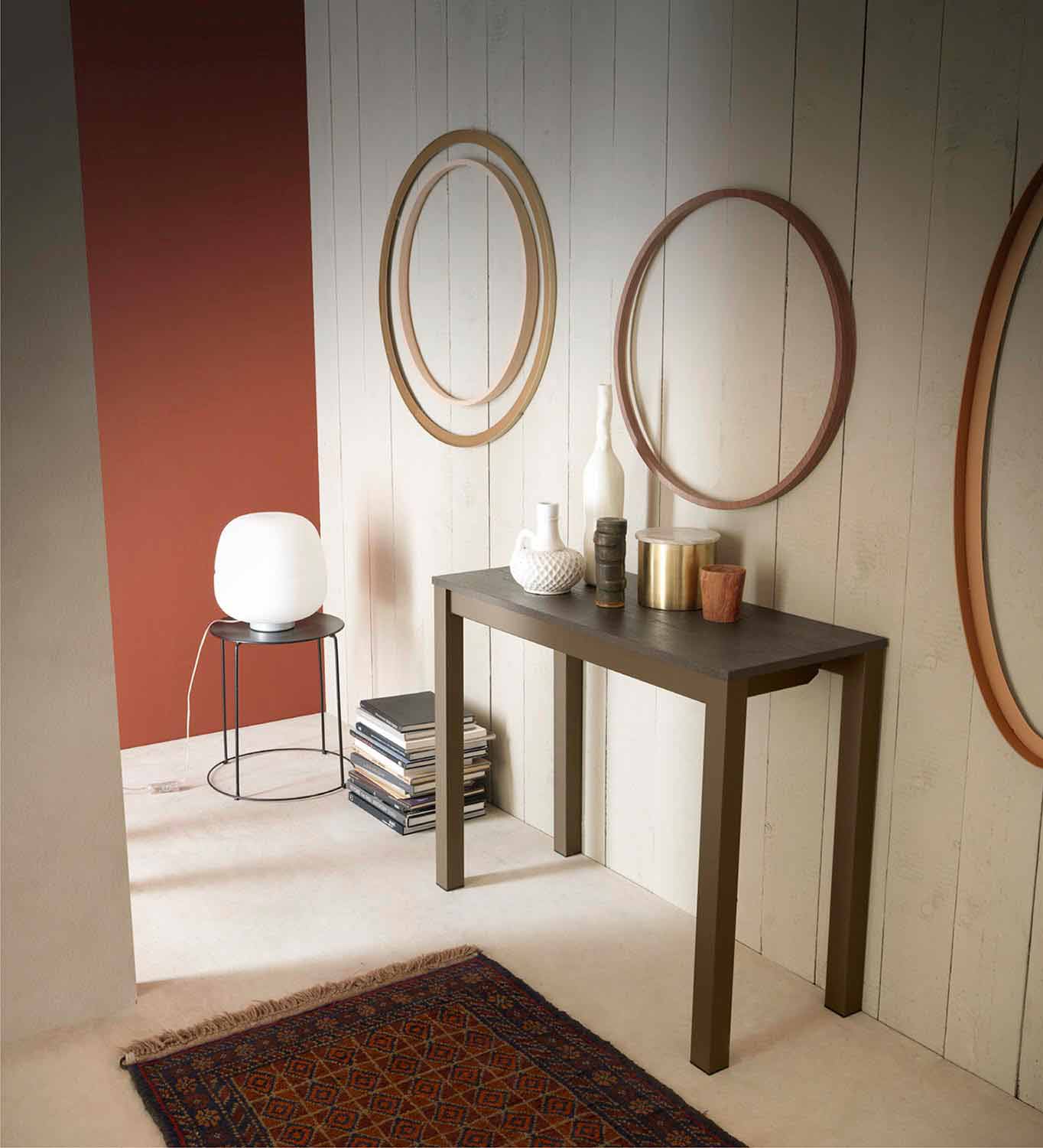 Uitschuifbare console die kan worden omgevormd tot een eettafel in metaal en gefineerd eiken Gemaakt in Italië.