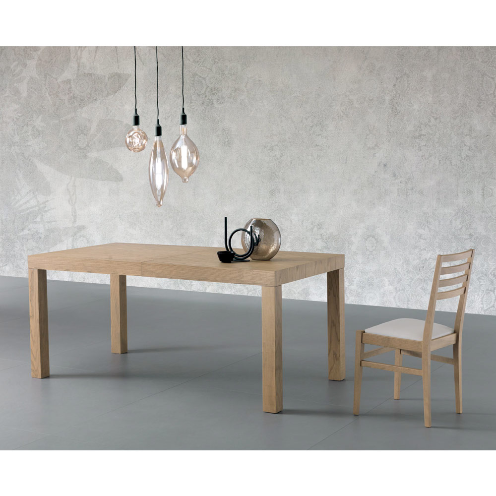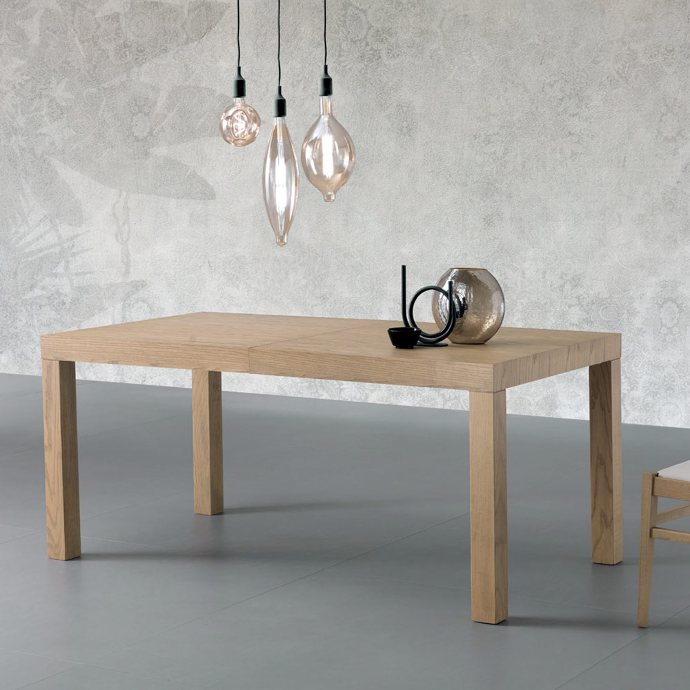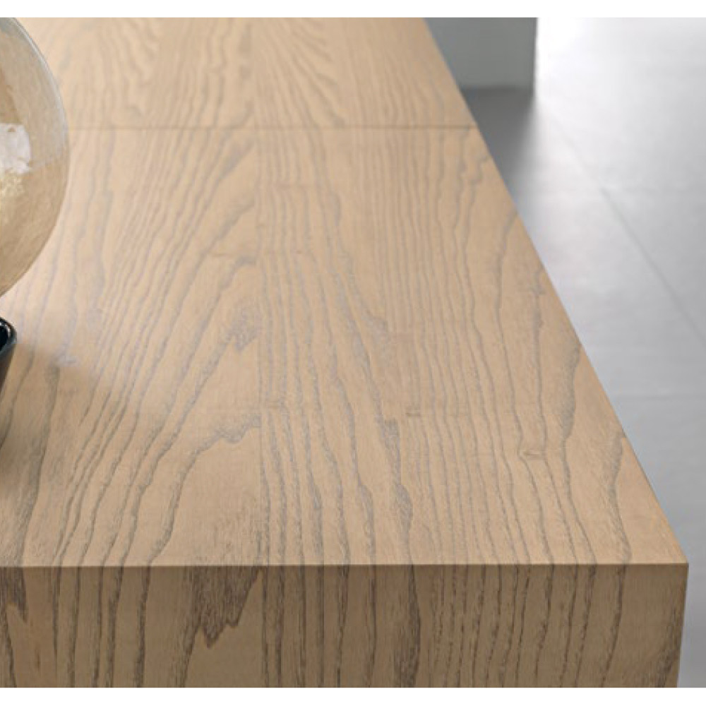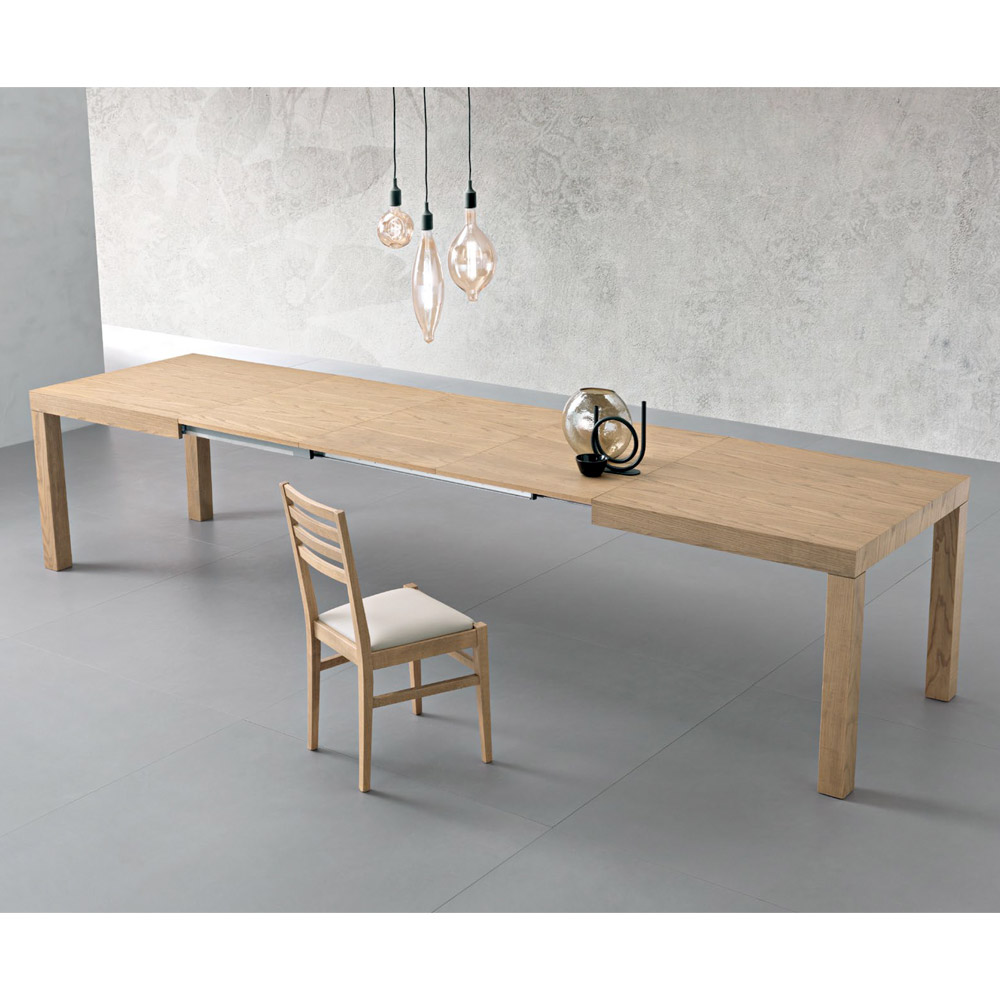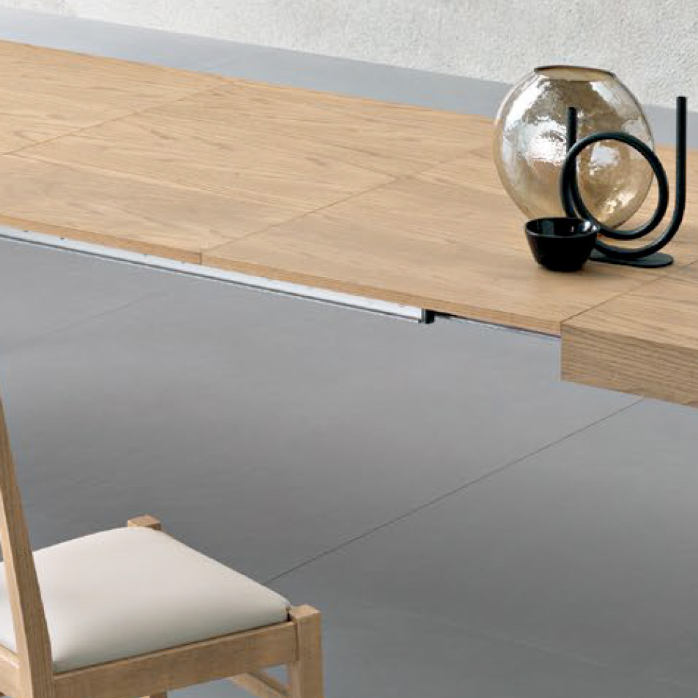Uitschuifbare rechthoekige tafel met essenfineer blad. 80 mm dik, opklapbaar.