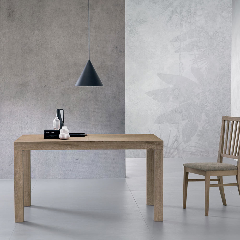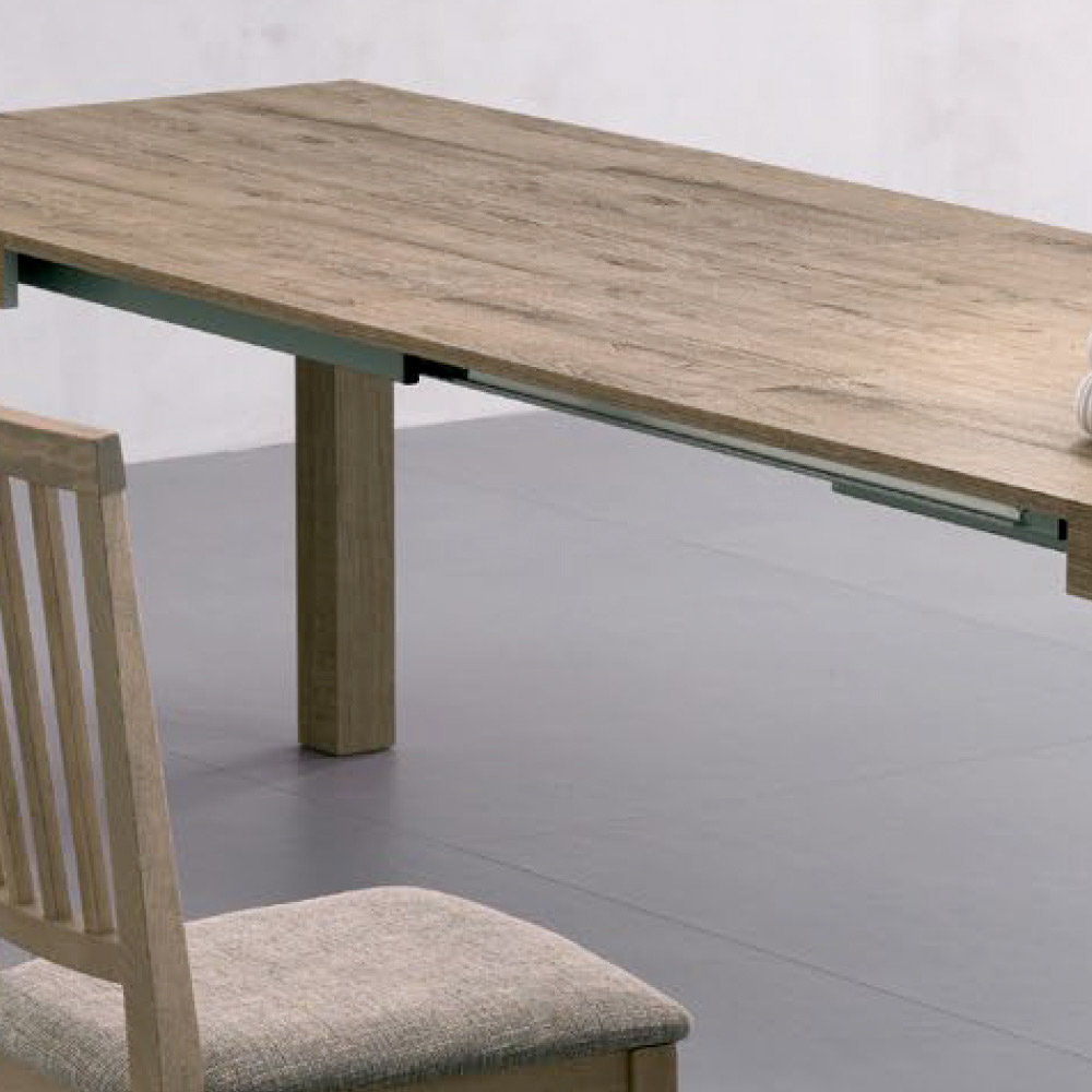 Uitschuifbare rechthoekige tafel met laminaatblad. 80 mm dikke, opvouwbare afwerking.