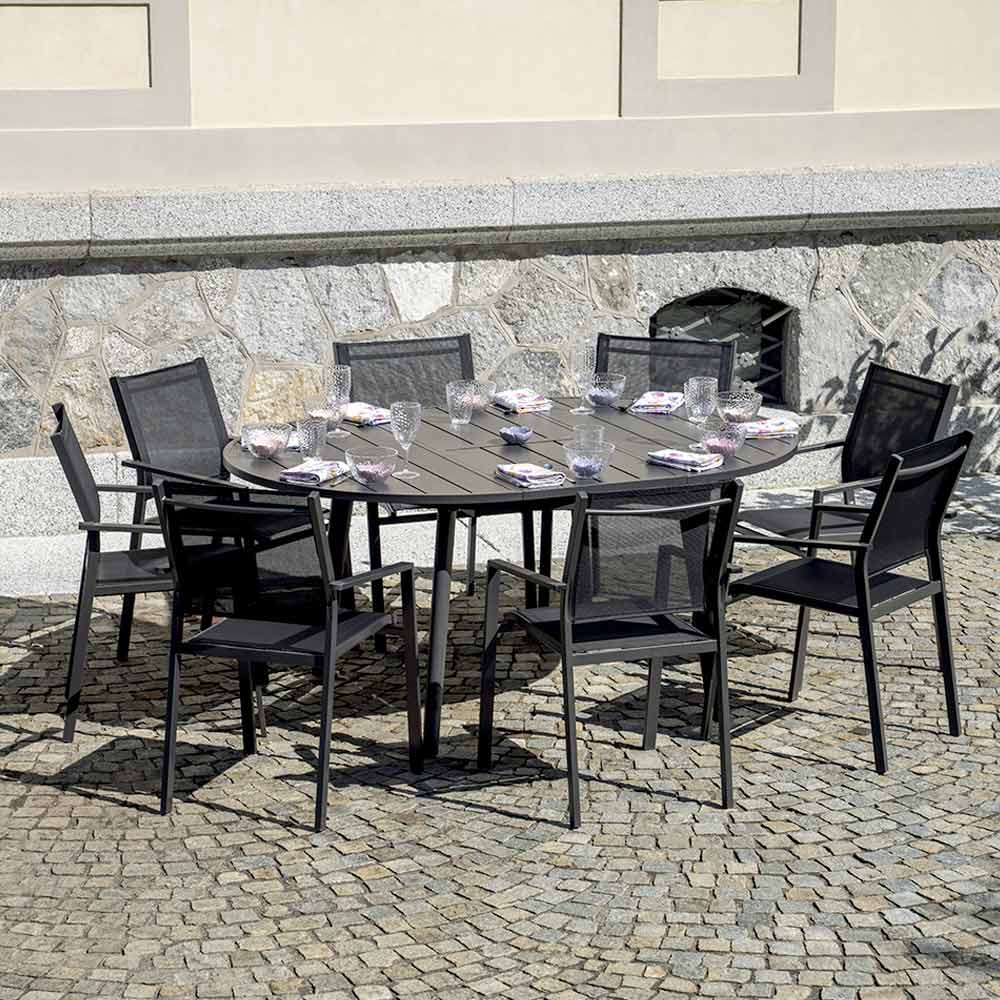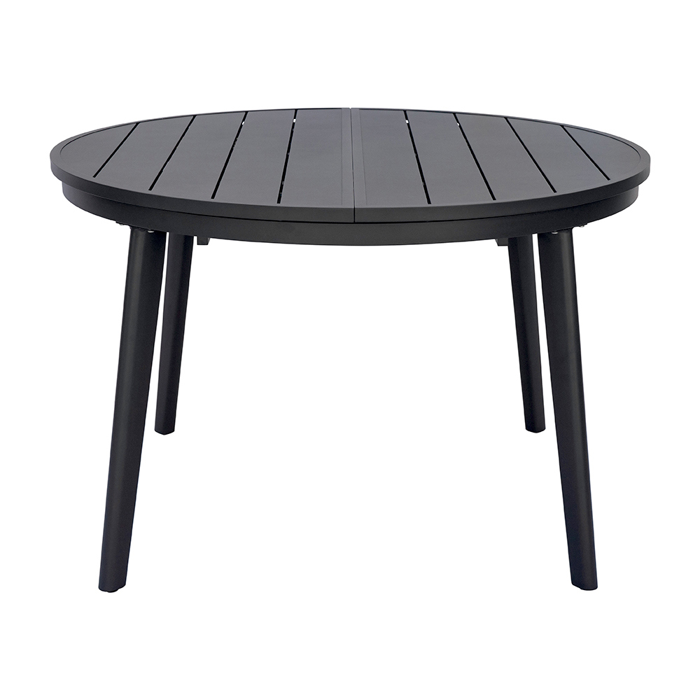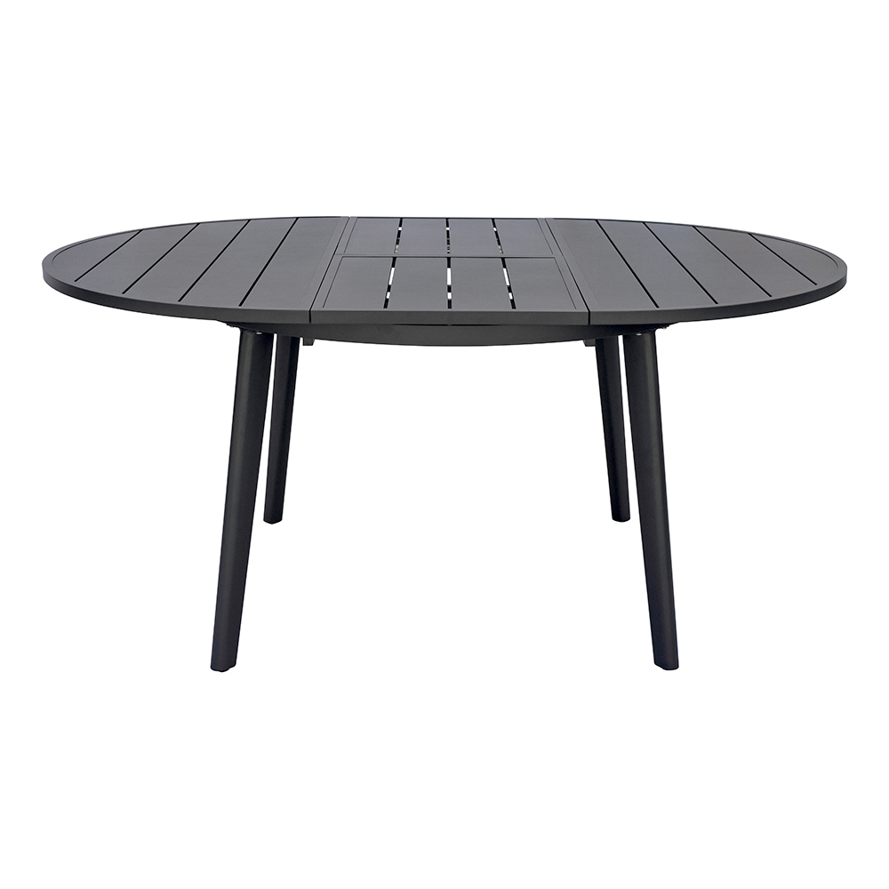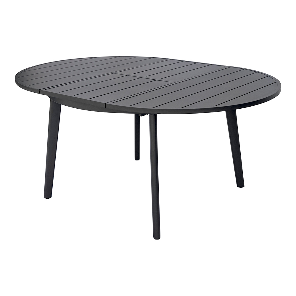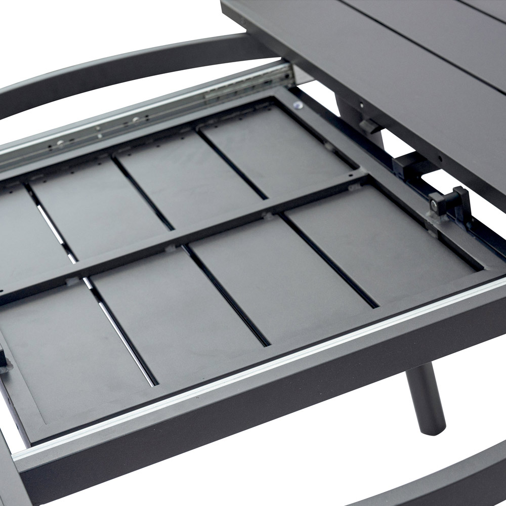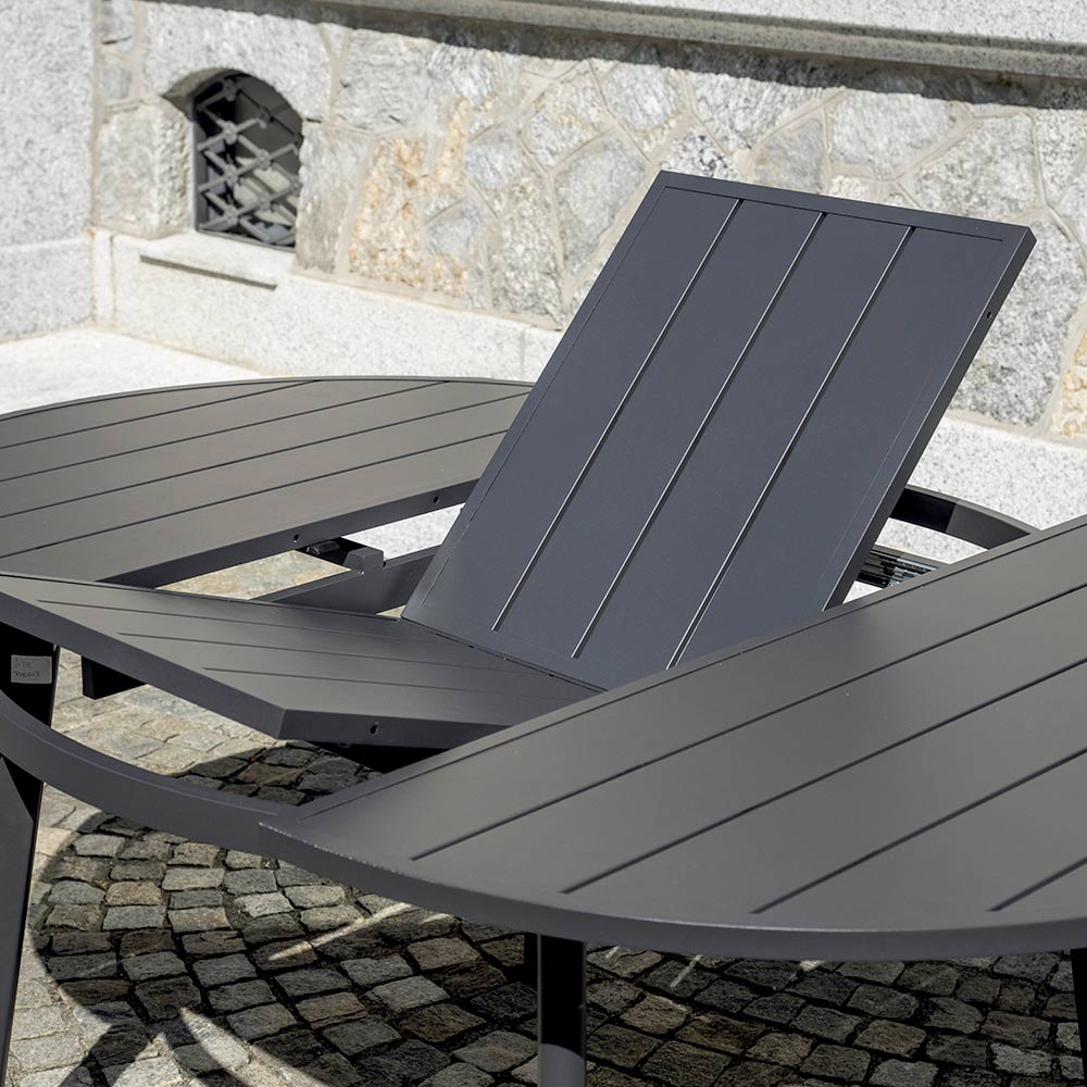 Het antraciete aluminium tafelblad zorgt voor stevigheid en duurzaamheid en is perfect bestand tegen weersinvloeden zonder na verloop van tijd zijn glans te verliezen. De elegante, vlakke lamellen geven de tafel een verfijnde, eigentijdse uitstraling, terwijl de solide structuur zorgt voor stabiliteit en lichtheid.