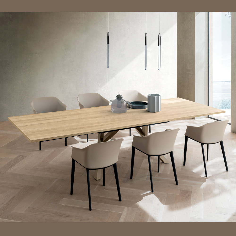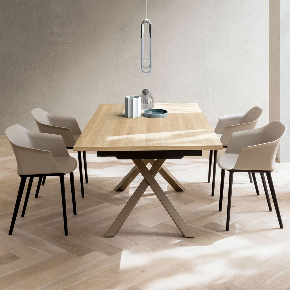 Het HPL -blad is perfect voor dagelijks gebruik zonder in te leveren op esthetiek. Dankzij het geïntegreerde uitschuifmechanisme kan de tafel eenvoudig worden uitgeschoven om comfortabel plaats te bieden aan meer gasten, waardoor het de perfecte tafel is voor familielunches en diners met vrienden.