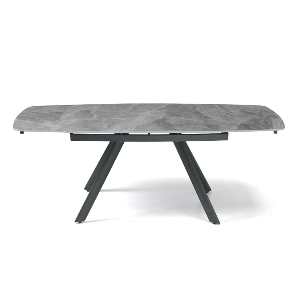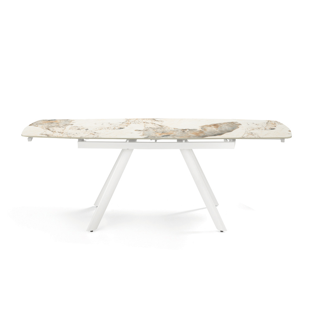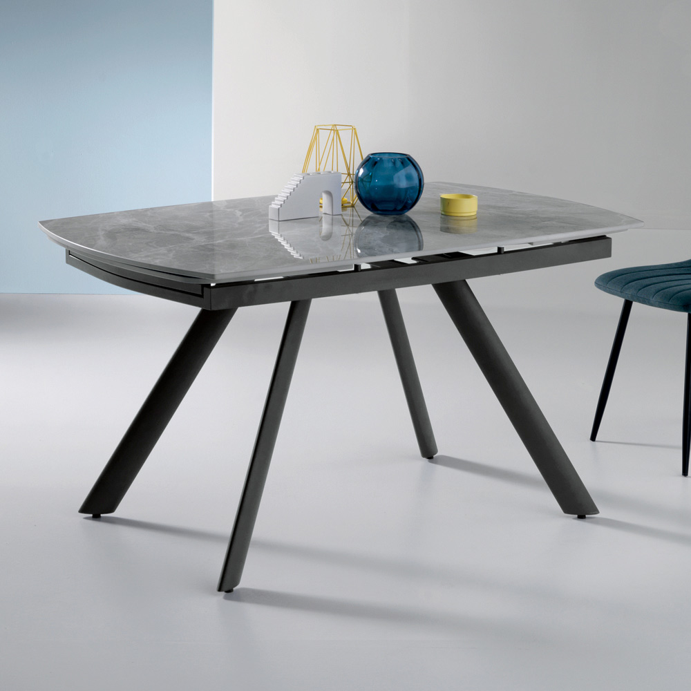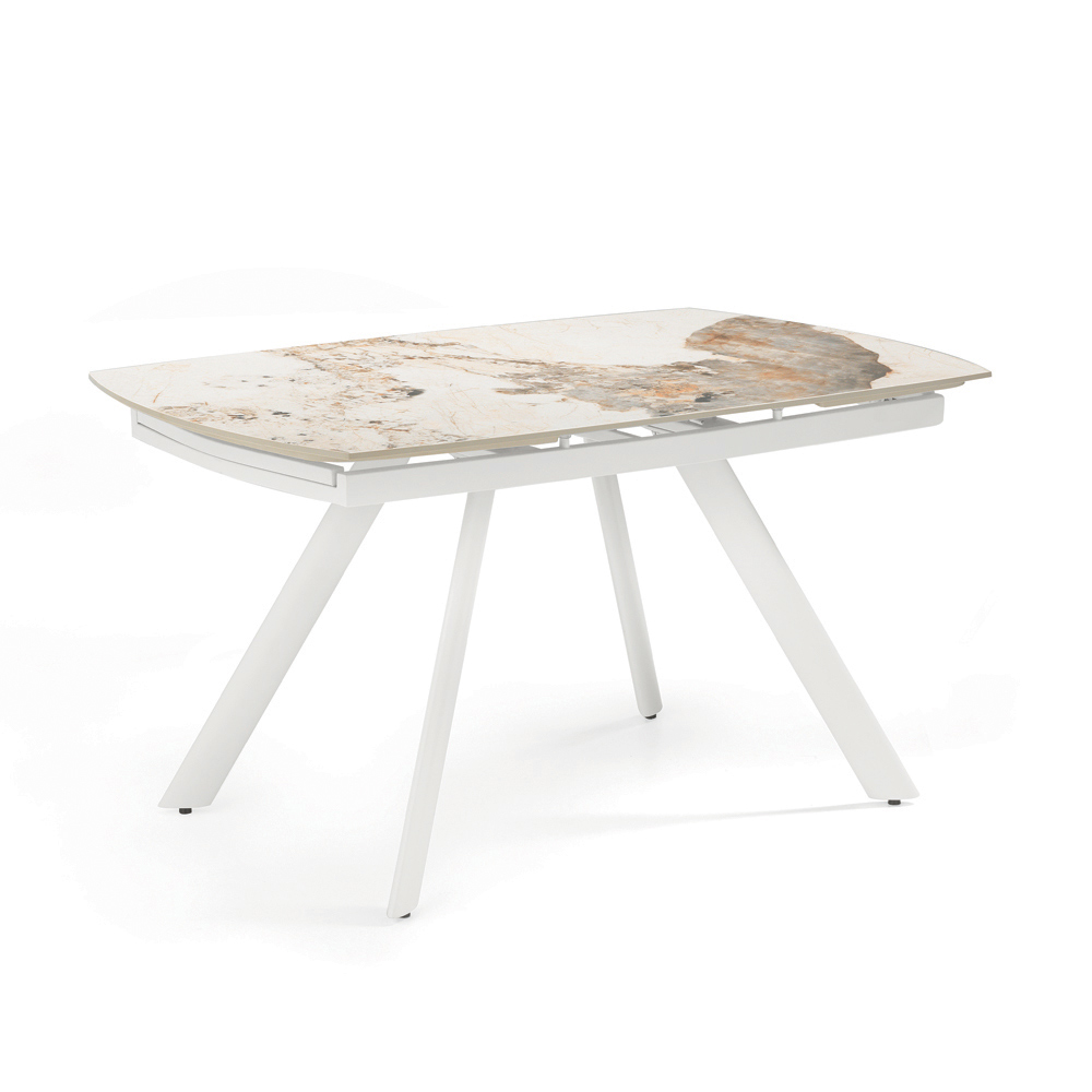 Een elegante, uitschuifbare eettafel met een modern design, ideaal om uw eetkamer of woonkamer stijlvol in te richten. Het blad van gesinterd steen met marmerlook biedt een verfijnd, duurzaam en gemakkelijk te reinigen oppervlak, perfect voor dagelijks gebruik. De gelakte metalen voet zorgt voor stabiliteit en stevigheid, waardoor een perfecte balans ontstaat tussen eigentijdse esthetiek en functionaliteit.