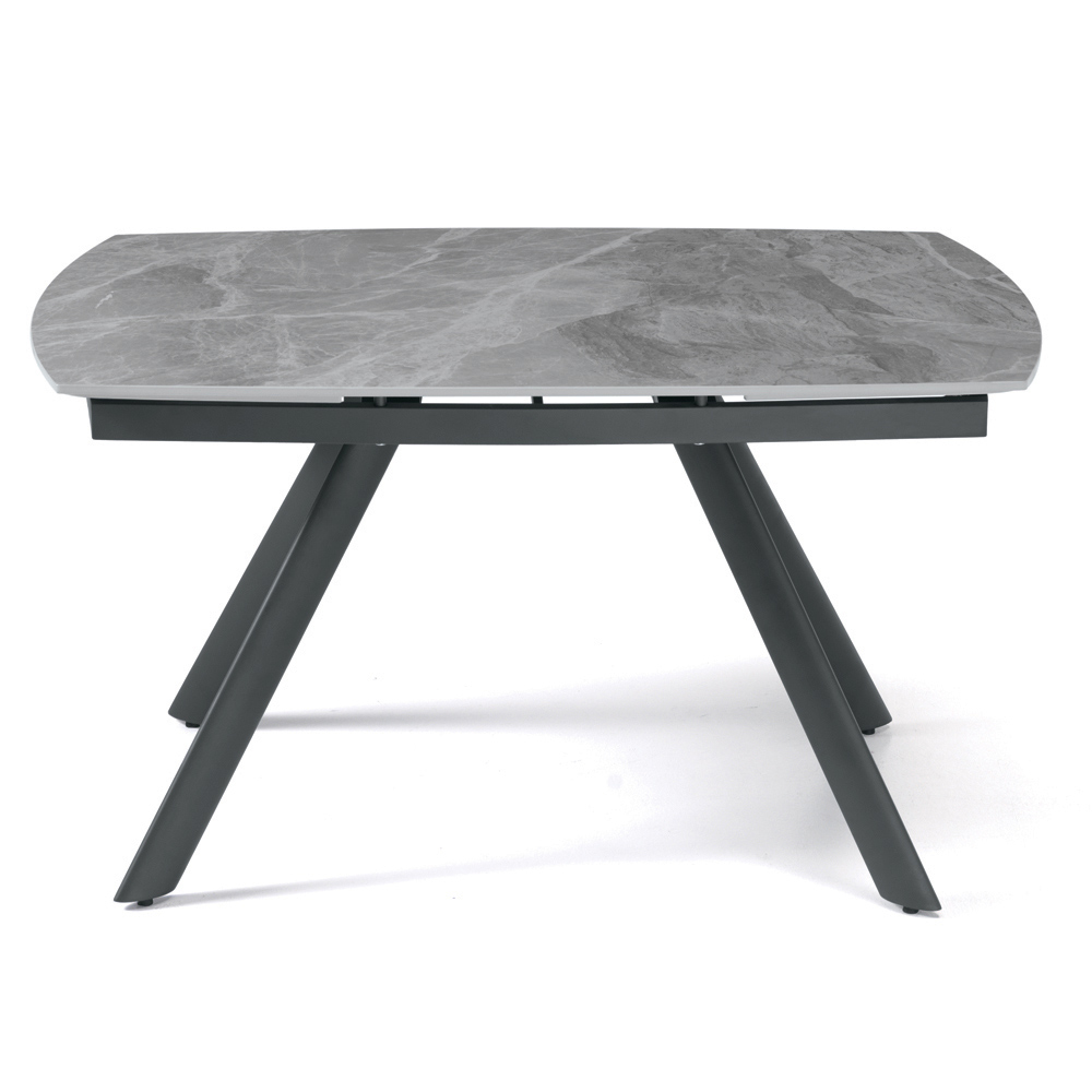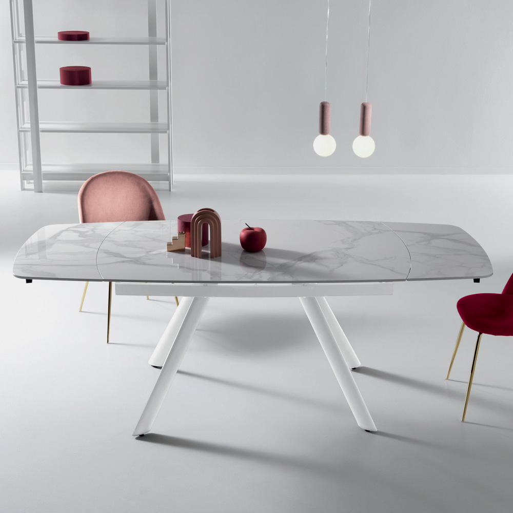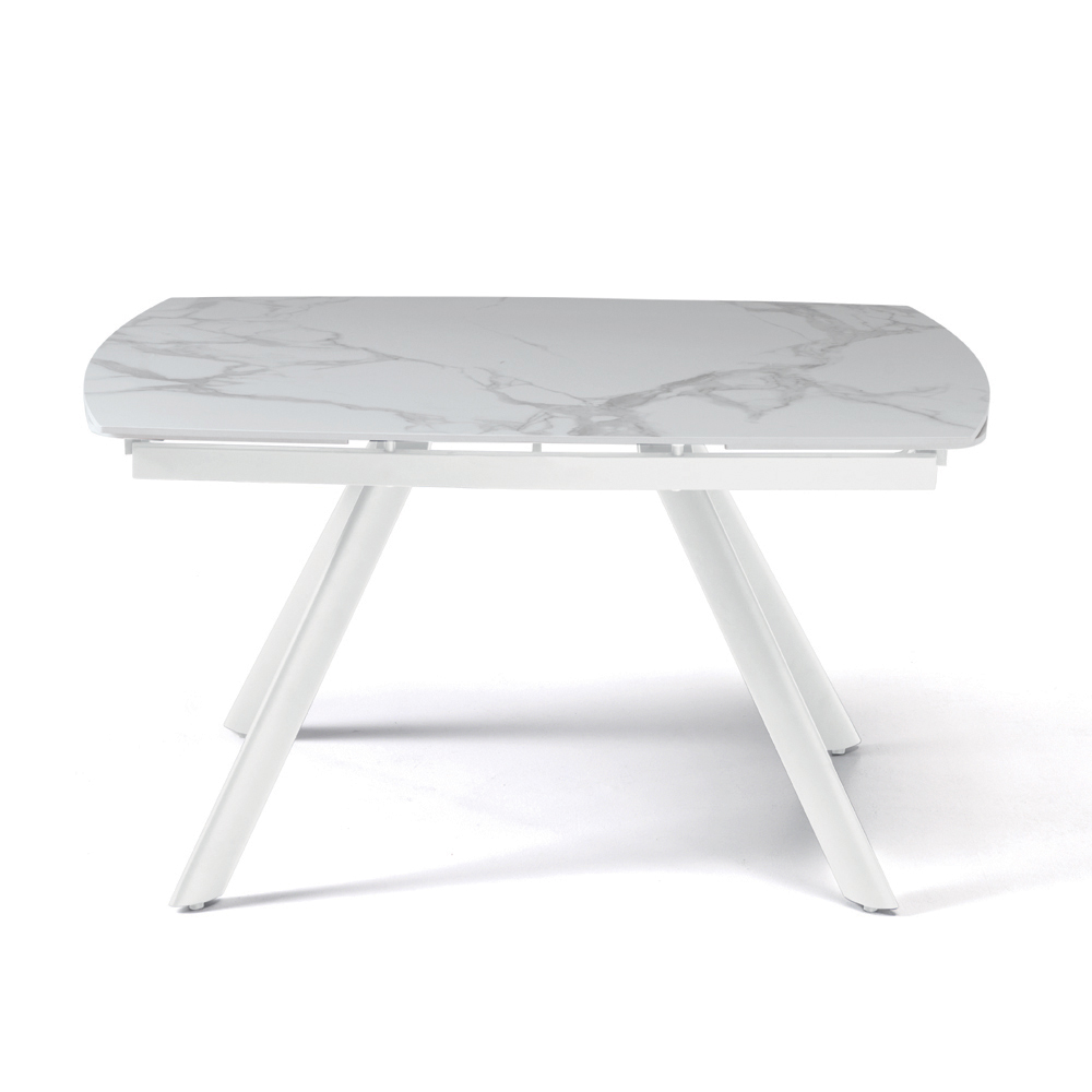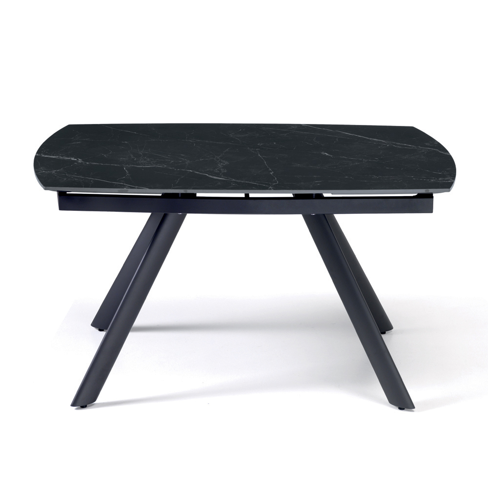 Een elegante, uitschuifbare eettafel met een modern design, ideaal om uw eetkamer of woonkamer stijlvol in te richten. Het blad van gesinterd steen met marmerlook biedt een verfijnd, duurzaam en gemakkelijk te reinigen oppervlak, perfect voor dagelijks gebruik. De gelakte metalen voet zorgt voor stabiliteit en stevigheid, waardoor een perfecte balans ontstaat tussen eigentijdse esthetiek en functionaliteit.