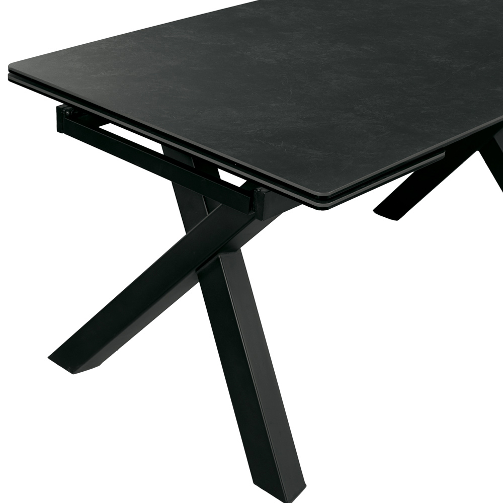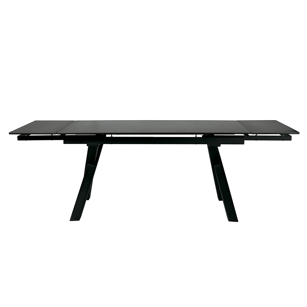 Deze eigentijdse tafel is ontworpen om de eetruimte te verfraaien met een elegante en gedurfde stijl. Het keramische en glazen blad combineert esthetiek en functionaliteit en biedt een kras-, hitte- en vlekbestendig oppervlak, ideaal voor dagelijks gebruik zonder aan verfijning in te boeten.
