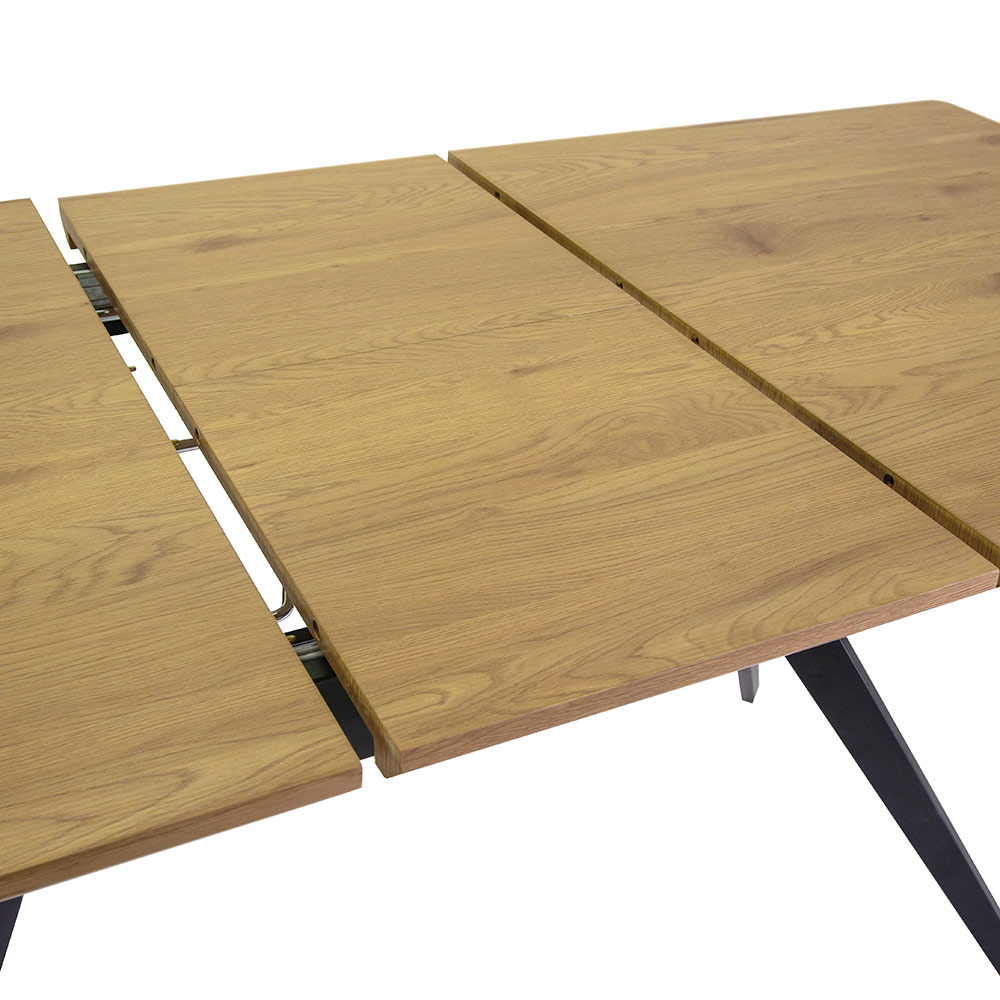 Functionaliteit en elegantie in één uitschuifbare tafel! Deze tafel combineert een solide en modern zwart gepoedercoat metalen frame met een warm en uitnodigend natuurlijk MDF blad .