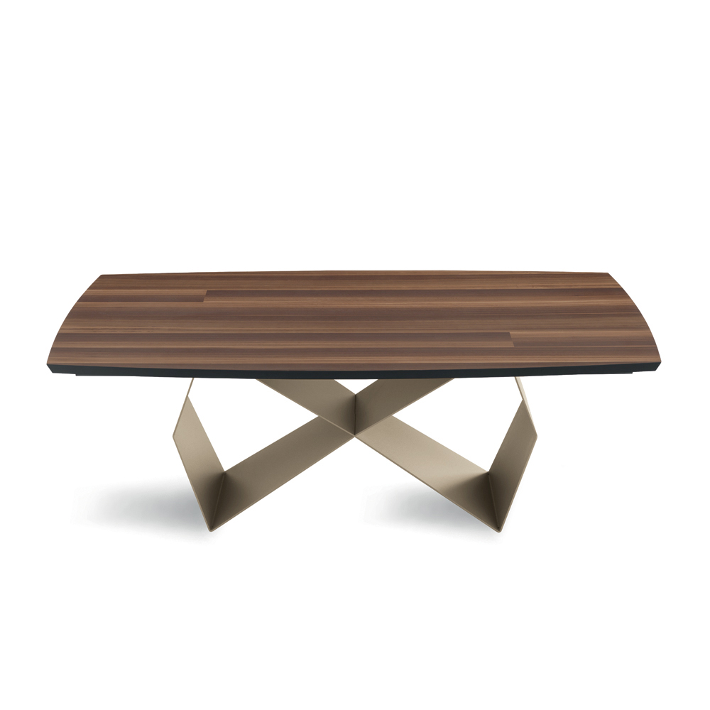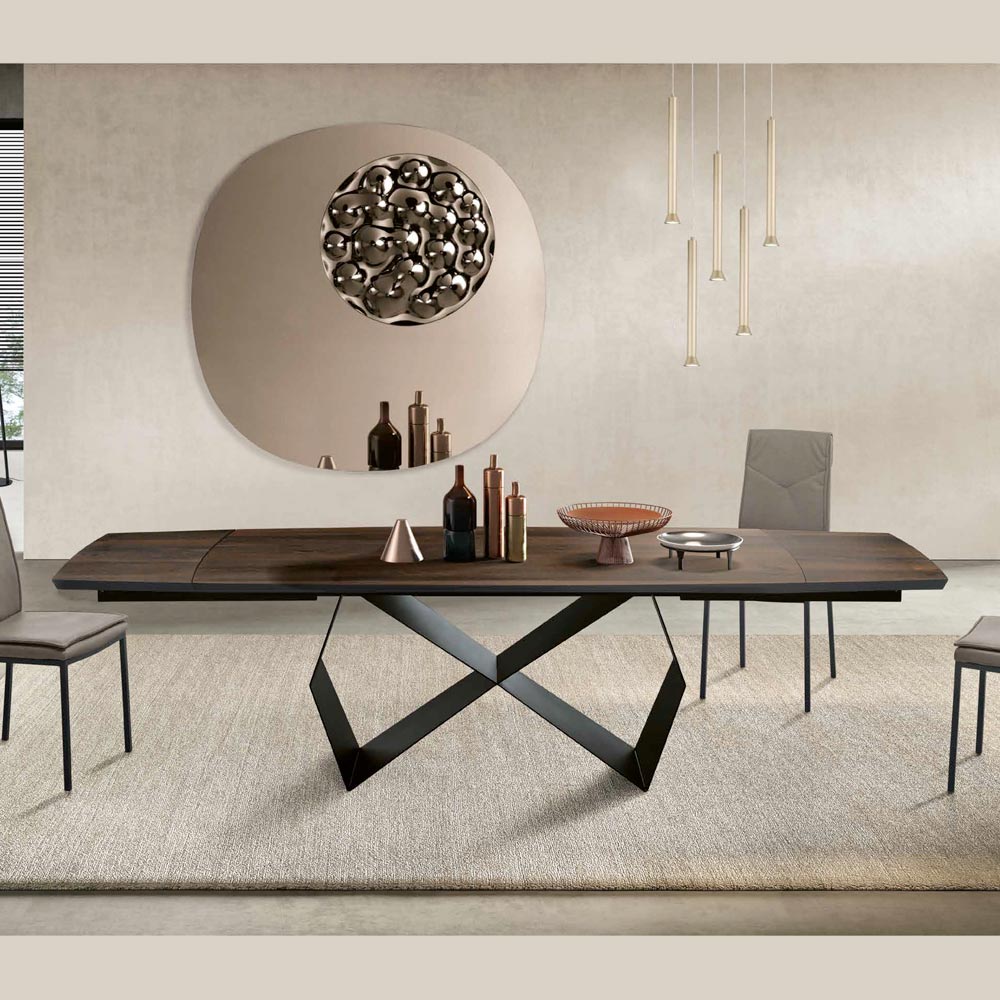 De metalen poten, met een opvallende, geometrische vorm, zijn geverfd om mooi te contrasteren met de houttint. Deze combinatie van materialen zorgt niet alleen voor stevige stabiliteit, maar voegt ook een indrukwekkend visueel element toe, waardoor deze tafel een echt middelpunt is in elke eetkamer of open ruimte.