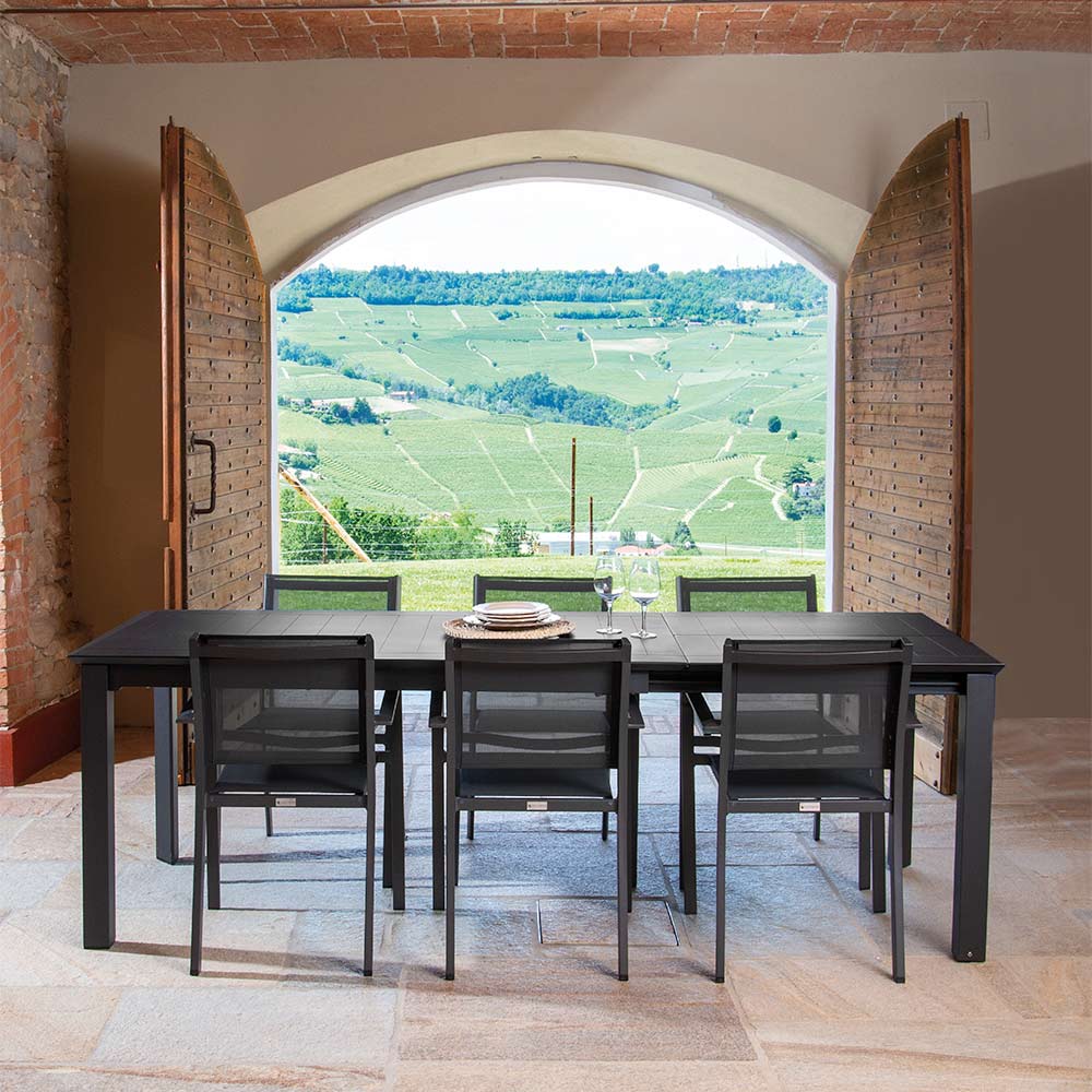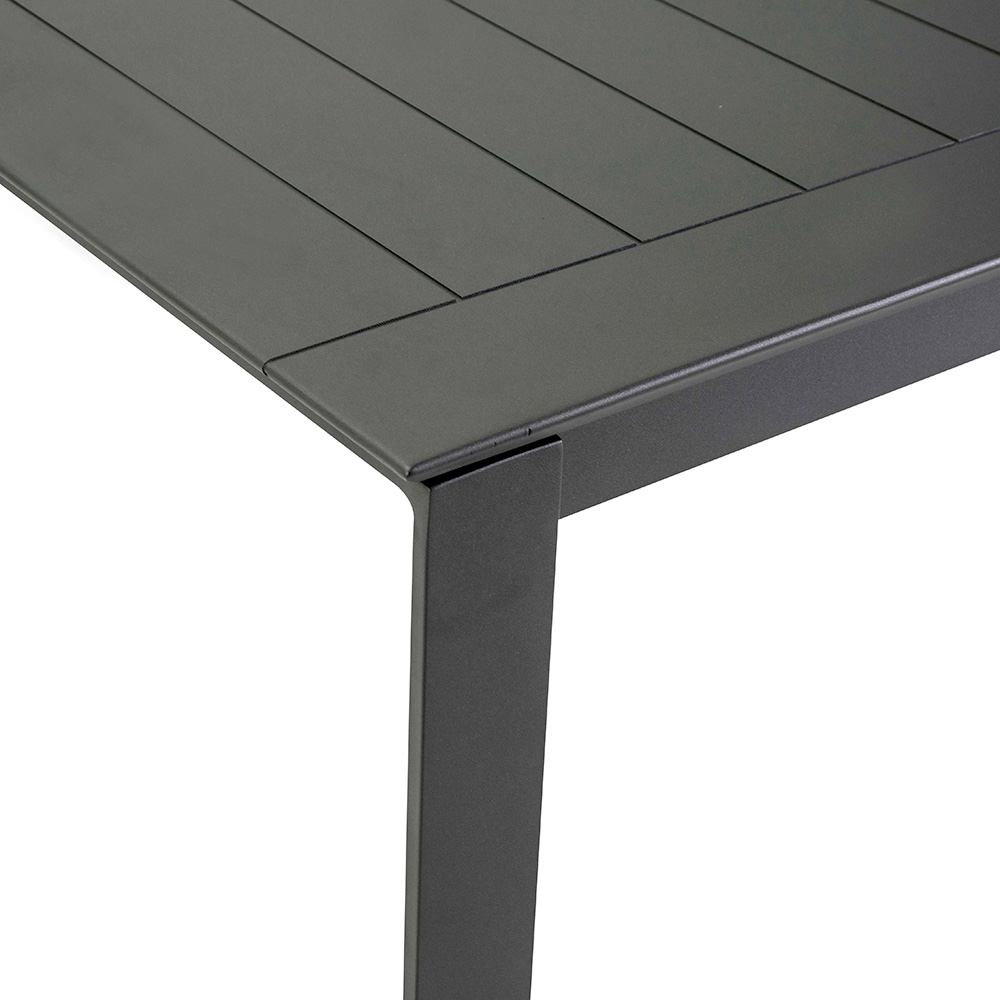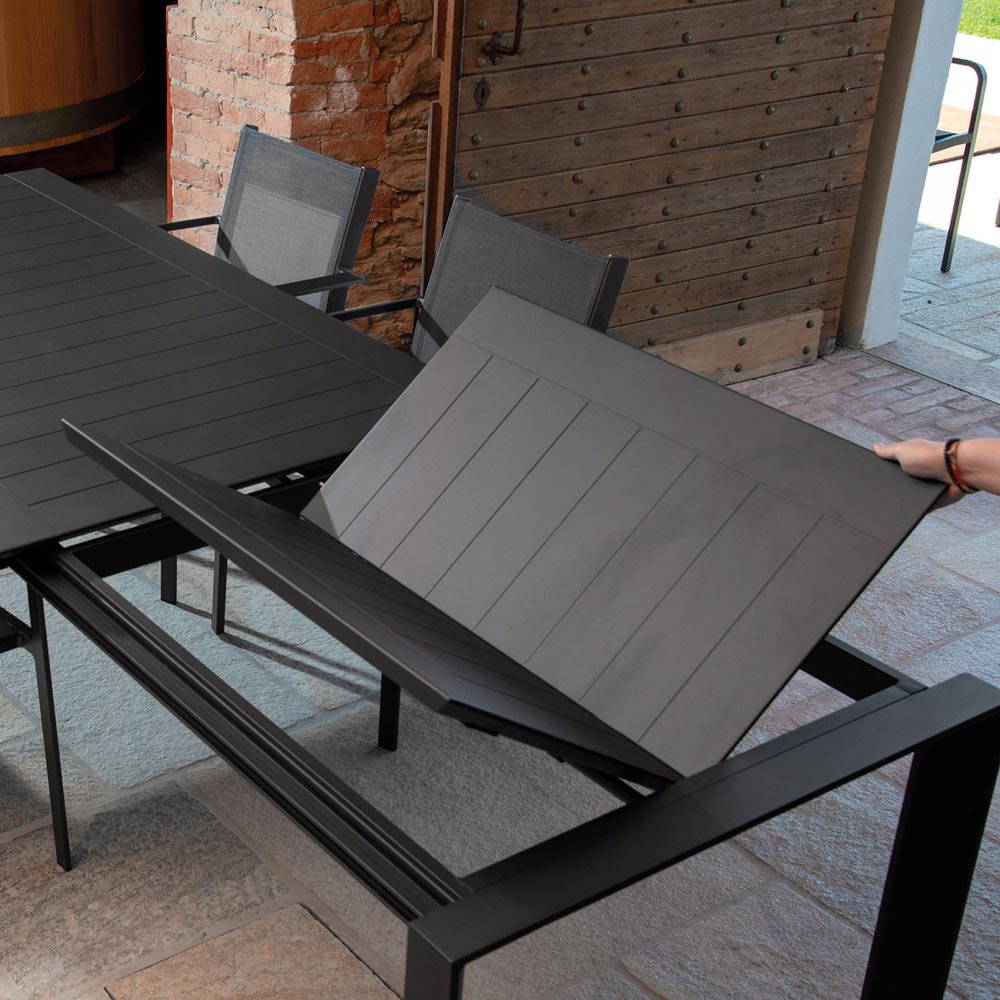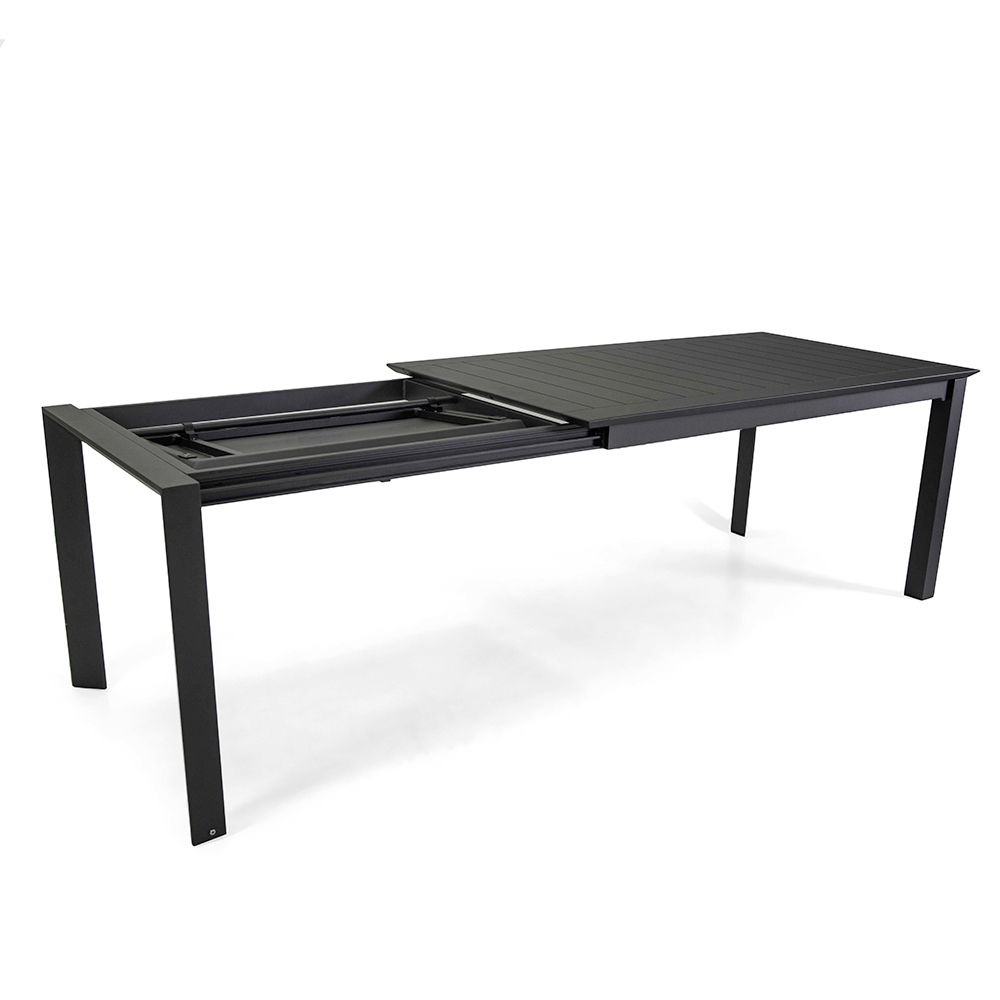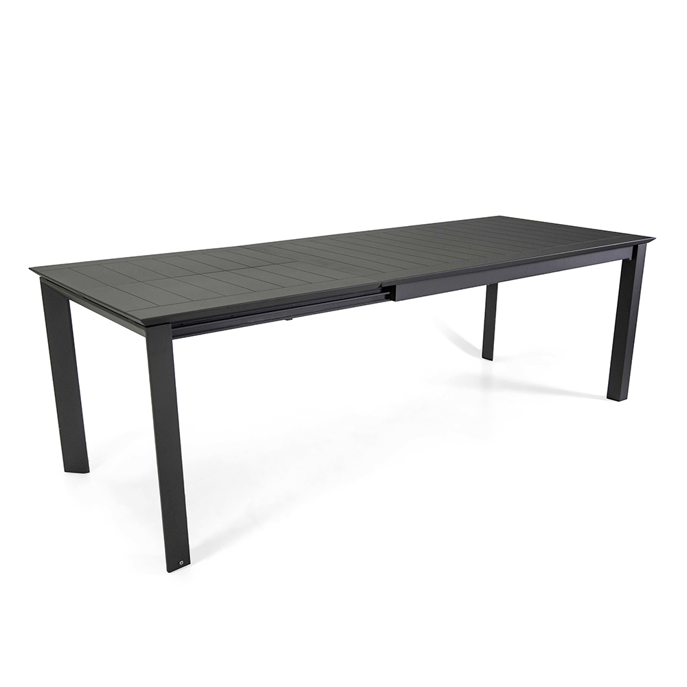 Deze uitschuifbare tafel van aluminium is de ideale keuze voor wie op zoek is naar veelzijdigheid zonder afbreuk te doen aan stijl en kwaliteit. Gemaakt van een stevig aluminium frame, combineert deze tafel duurzaamheid met lichtheid, waardoor het perfect is voor buitengebruik in alle weersomstandigheden. De afwerking voegt een vleugje moderne elegantie toe dat perfect past in elke buitenomgeving, van de tuin tot het terras.
