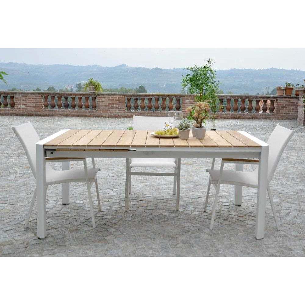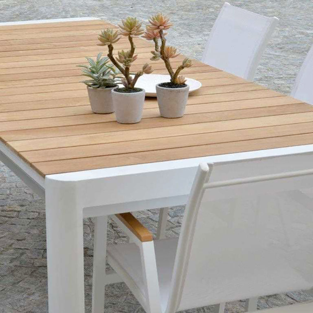 De tafel is ontworpen voor elke gelegenheid, gemakkelijk uit te breiden om meer gasten te ontvangen of in te krimpen voor meer intiem dagelijks gebruik. De combinatie van wit aluminium en teakhout is niet alleen visueel aantrekkelijk, maar ook uiterst praktisch, met een oppervlak dat gemakkelijk schoon te maken en te onderhouden is.