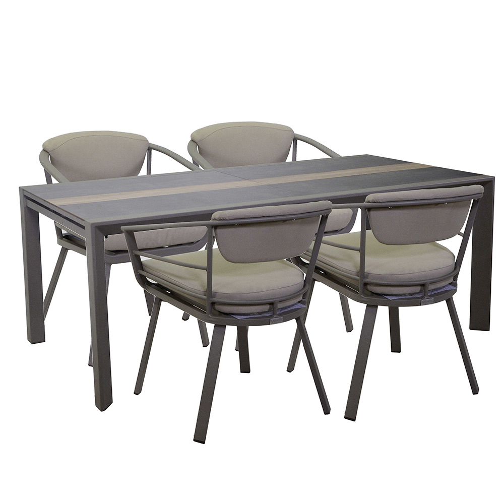 Ontdek de elegantie en functionaliteit van deze tafel met gepoedercoat aluminium frame , ontworpen om een vleugje stijl en weerstand toe te voegen aan uw buitenruimtes. Het 6mm dikke HPL (High Pressure Laminate) tafelblad garandeert duurzaamheid en een verfijnde esthetiek, met een afwerking bestaande uit 9 houtkleurige panelen die harmonieus integreren in het moderne ontwerp.