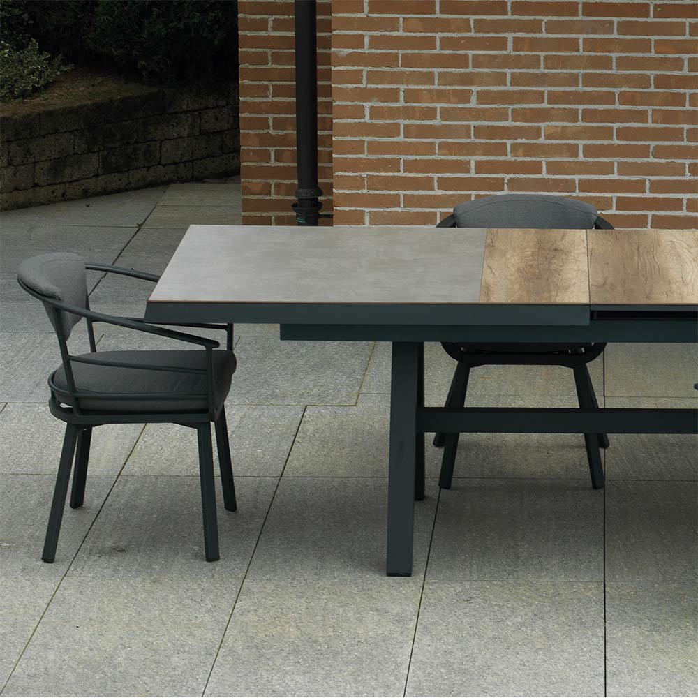 Ideaal voor diners bij maanlicht of ontspannen middagen met vrienden en familie, deze tafel combineert stijl, comfort en functionaliteit, waardoor het de perfecte keuze is voor elke buitensetting.