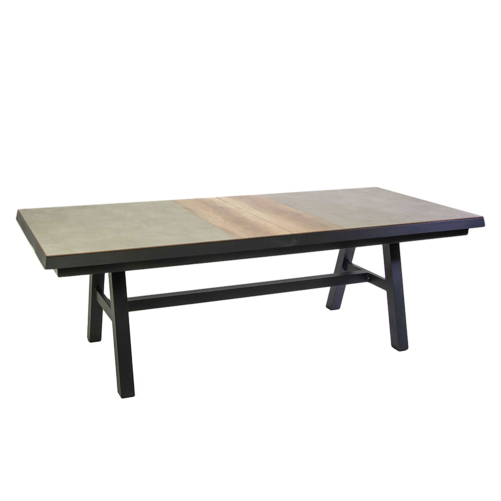 Breng een vleugje elegantie en moderniteit naar je buitenruimte met deze verfijnde tafel, perfect voor elke gelegenheid. Het antracietkleurige aluminium frame is behandeld met een poedercoating om weerstand en duurzaamheid te garanderen, waardoor het er na verloop van tijd onberispelijk blijft uitzien. Het 6 mm HPL blad biedt een solide en stijlvol oppervlak, verdeeld in 5 panelen die samen een aantrekkelijk en functioneel ontwerp vormen.