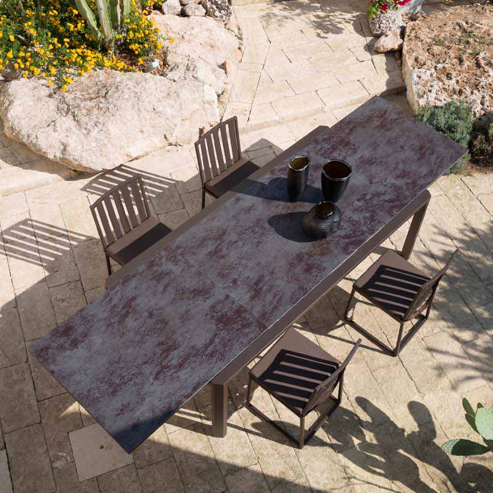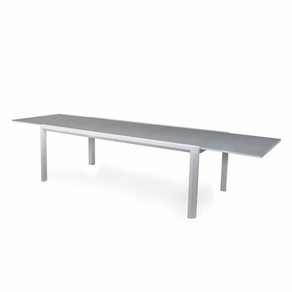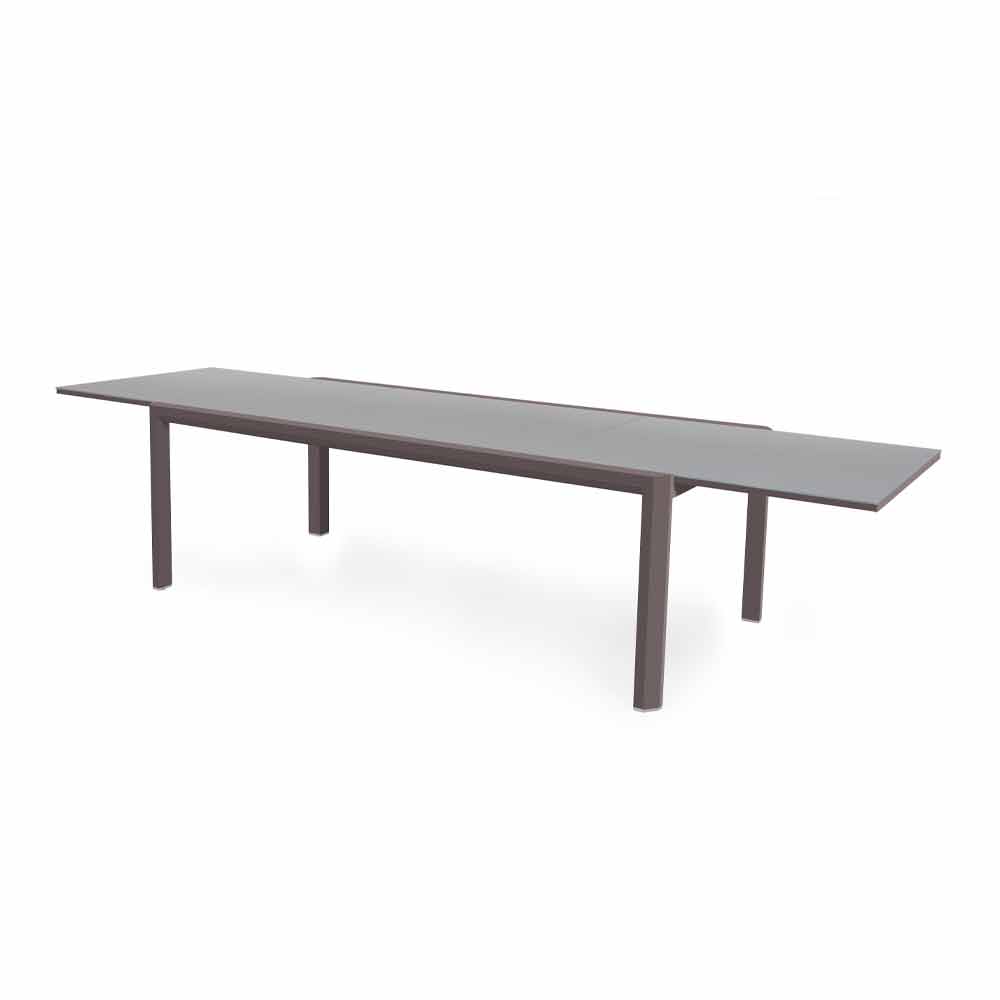 Eettafel voor buiten uitschuifbaar tot 340 cm, aluminium structuur in 3 afwerkingen en blad van glas of laminaat.