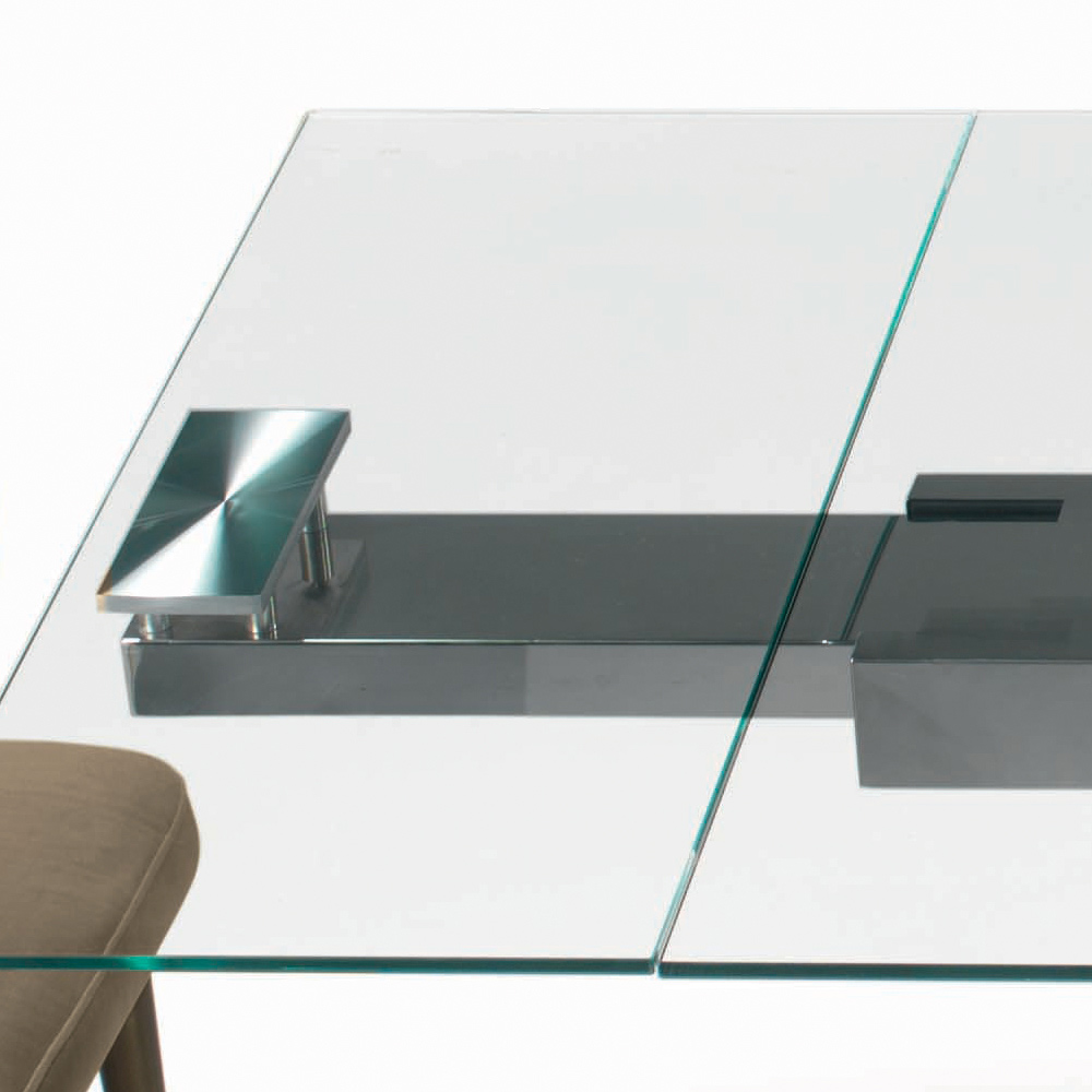 Uitschuifbare woonkamertafel met geïntegreerde verlengstukken, glazen blad,