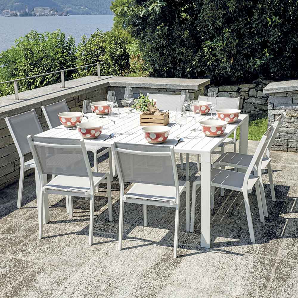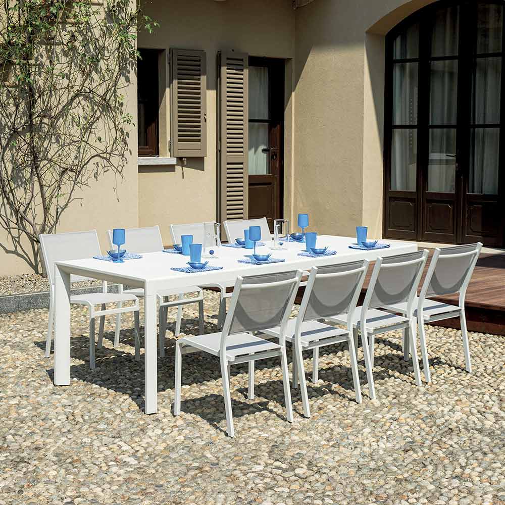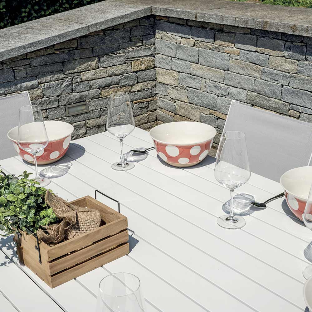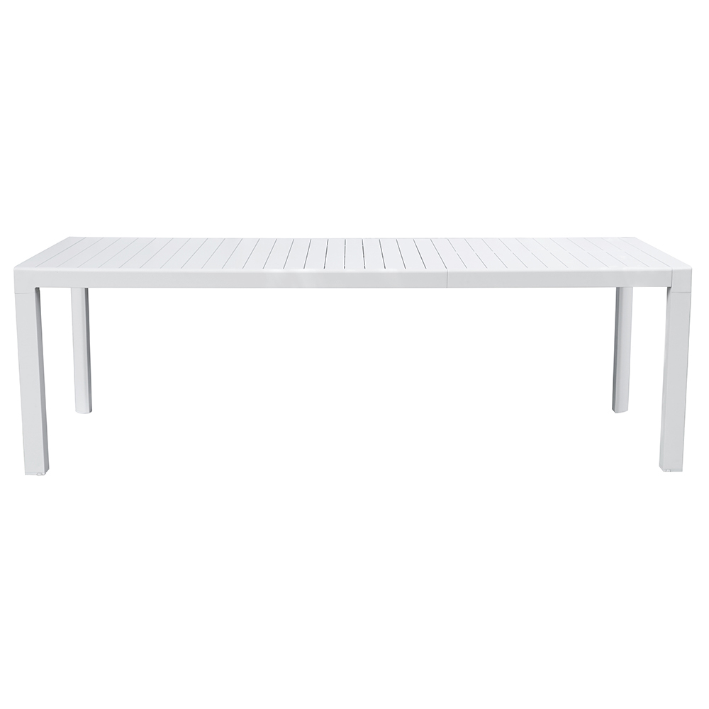 Elegantie, kracht en functionaliteit komen samen in deze witte aluminium tafel met lattenblad, een meubelstuk dat functionaliteit en moderne stijl combineert. De witte afwerking en strakke lijnen maken het geschikt voor elke buitenruimte, van de tuin tot het terras, en voegen een vleugje tijdloze verfijning toe.