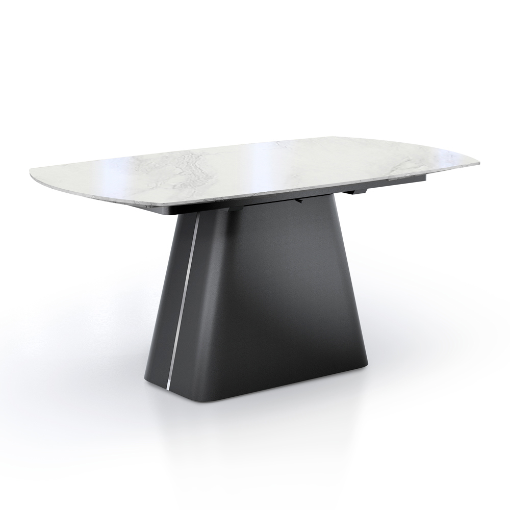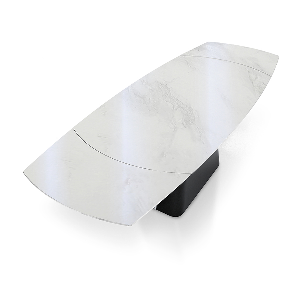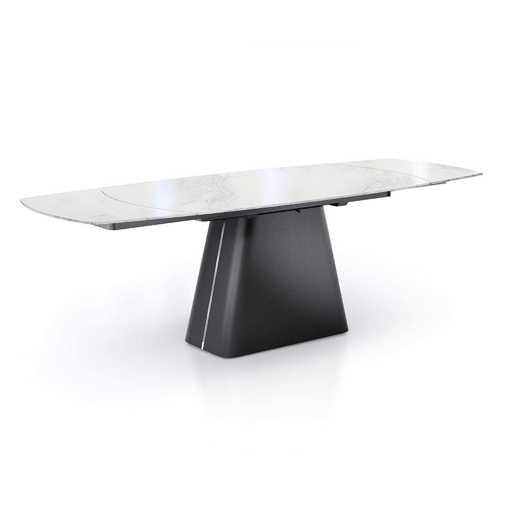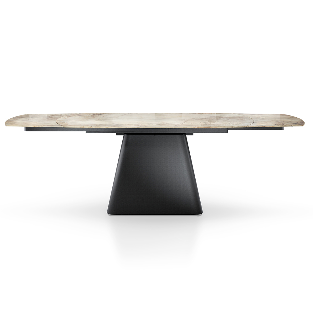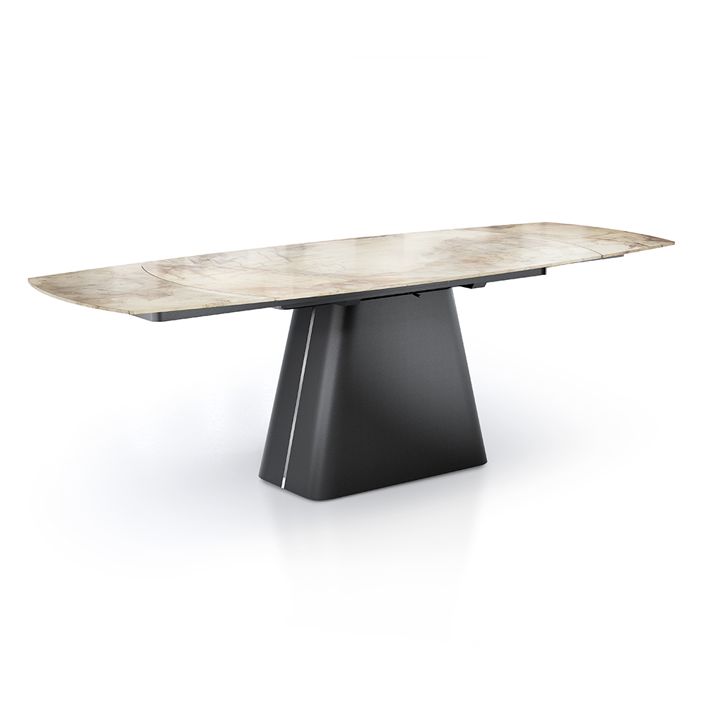 Deze uitschuifbare tafel is een meesterwerk van design en functionaliteit, ideaal voor wie elegantie en veelzijdigheid wil combineren in één meubelstuk. Het oppervlak staat op een stevige en stilistisch opvallende zwarte metalen basis en biedt een verbluffend visueel contrast dat een blikvanger is in elke eetkamer.