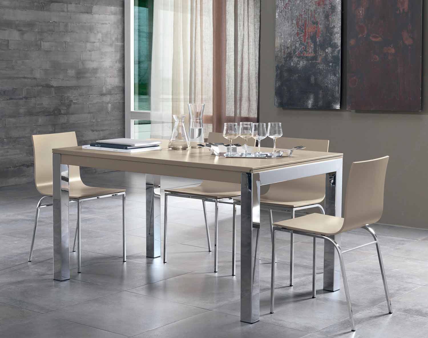 Design keukentafel uitschuifbaar tot 350 cm met tanganika walnoot gefineerd houten blad en verchroomde metalen poten, made in Italy.