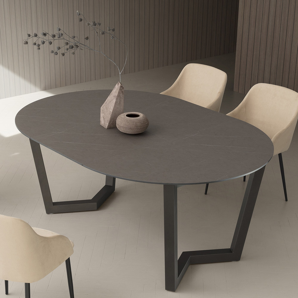 Ronde eettafel met uitschuifbaar blad in gelaagd HPL Made in Italy.