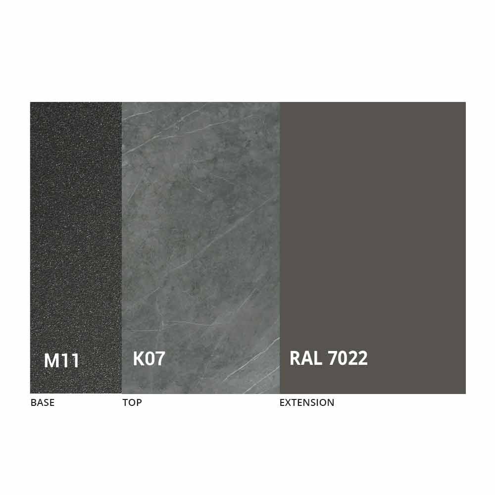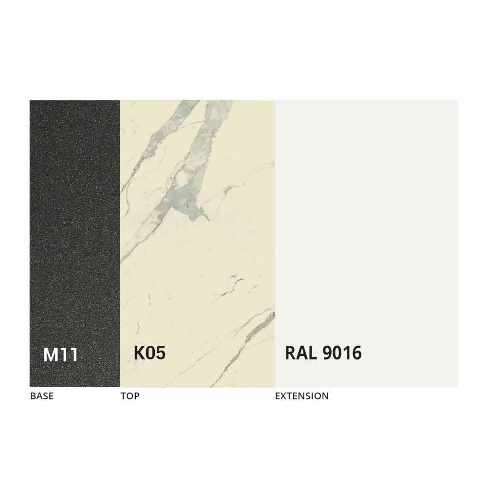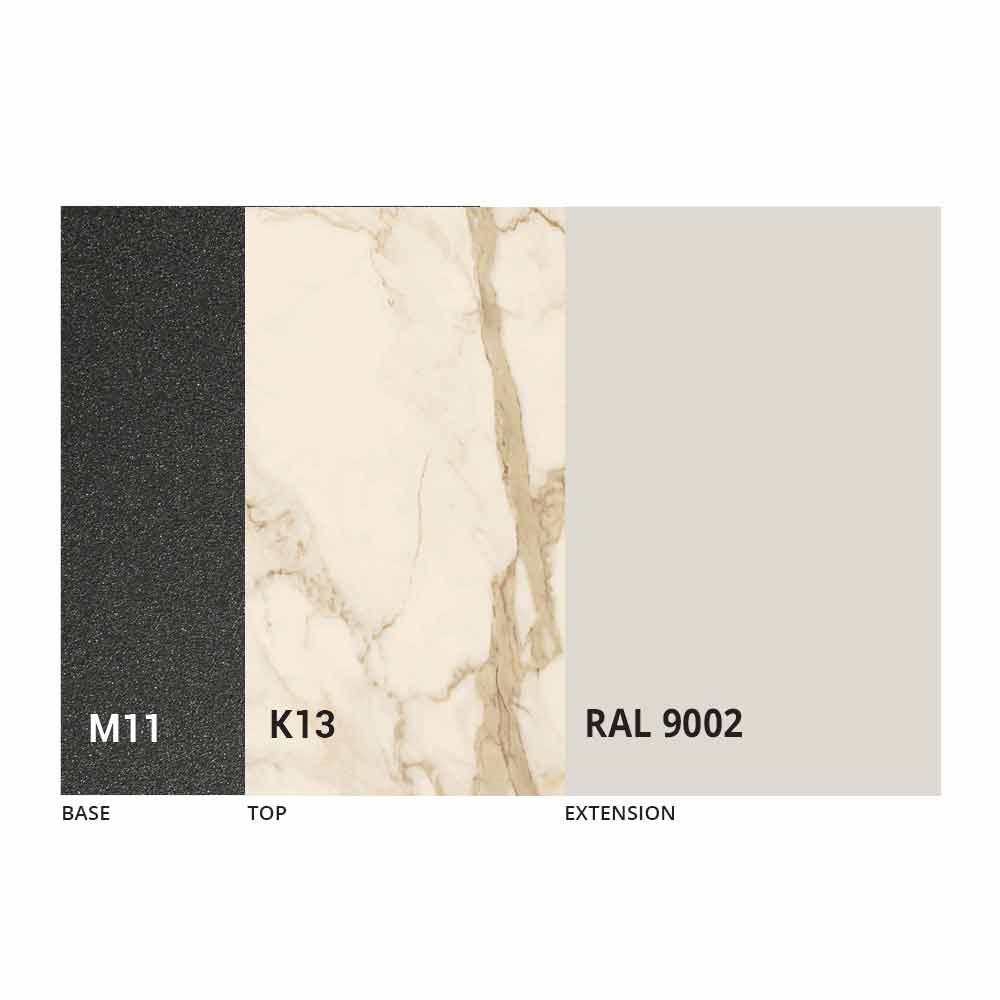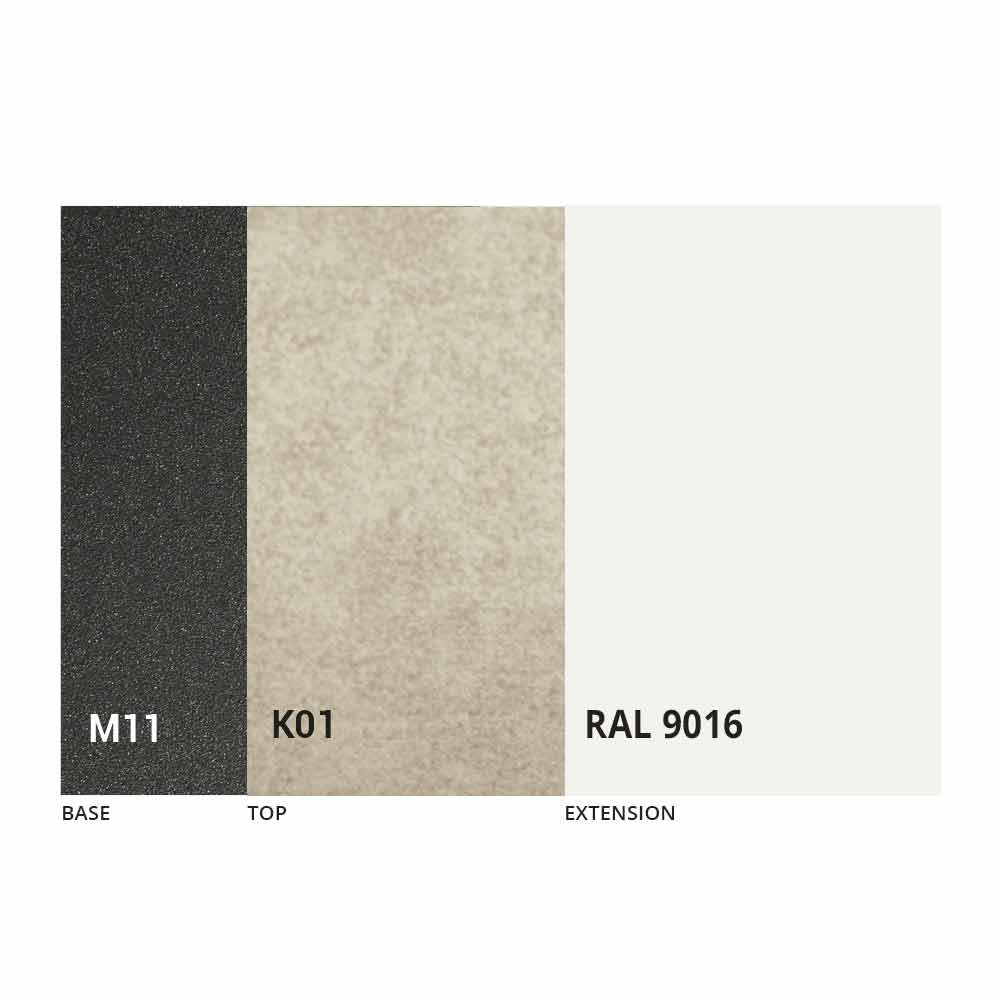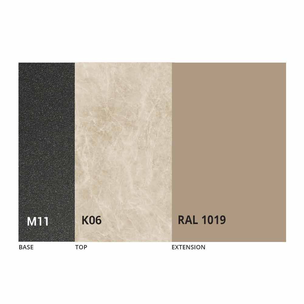 Het blad en de basis van de tafel kunnen worden aangepast met verschillende materialen en voorbeeldafwerkingen of RAL-lakken. Neem voor informatie contact met ons op via het daarvoor bestemde formulier "