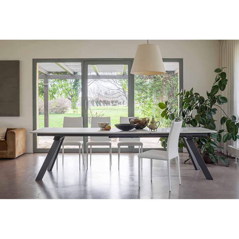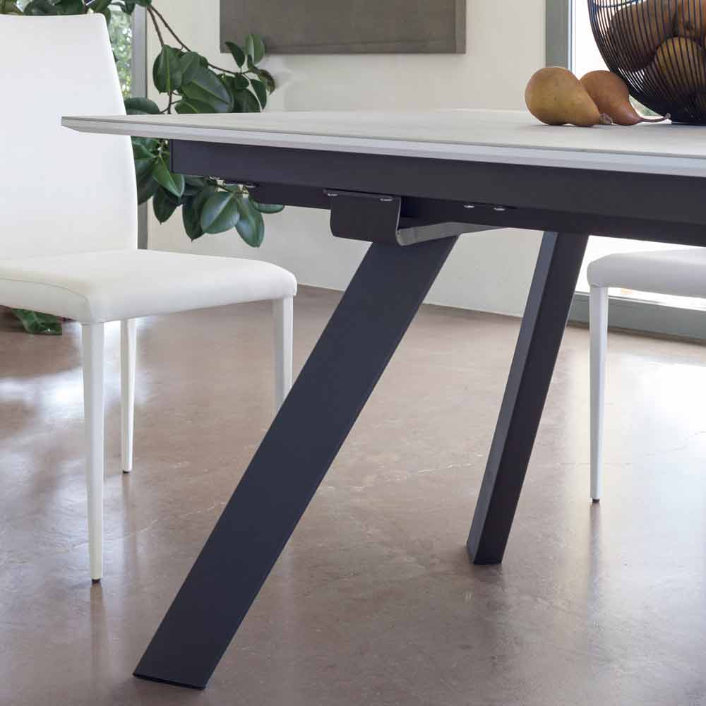 Uitschuifbare eettafel in keramiek en metalen onderstel gemaakt in Italië.