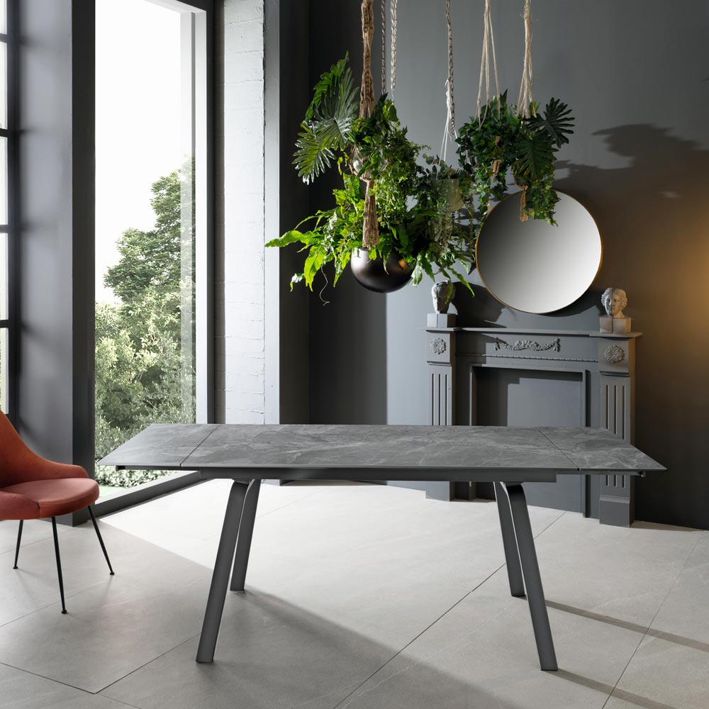 Wat de aandacht trekt is de expressieve kracht van deze uitschuifbare tafel in een eigentijdse en industriële stijl. Het ontwerp wordt gekenmerkt door het elegante blad van gesinterde steen dat smaakvol aansluit bij het massieve metalen onderstel. Het biedt veel mogelijke combinaties tussen de afwerkingen van het rechthoekige blad en de afwerkingen van het onderstel, waardoor persoonlijke expressie en smaak wordt bevredigd en de geest wordt weerspiegeld van de context waarin het wordt geplaatst. Dankzij de uitbreidbaarheid slaagt het erin de perfecte bondgenoot te worden bij het creëren van unieke en warme, gezellige ruimtes.